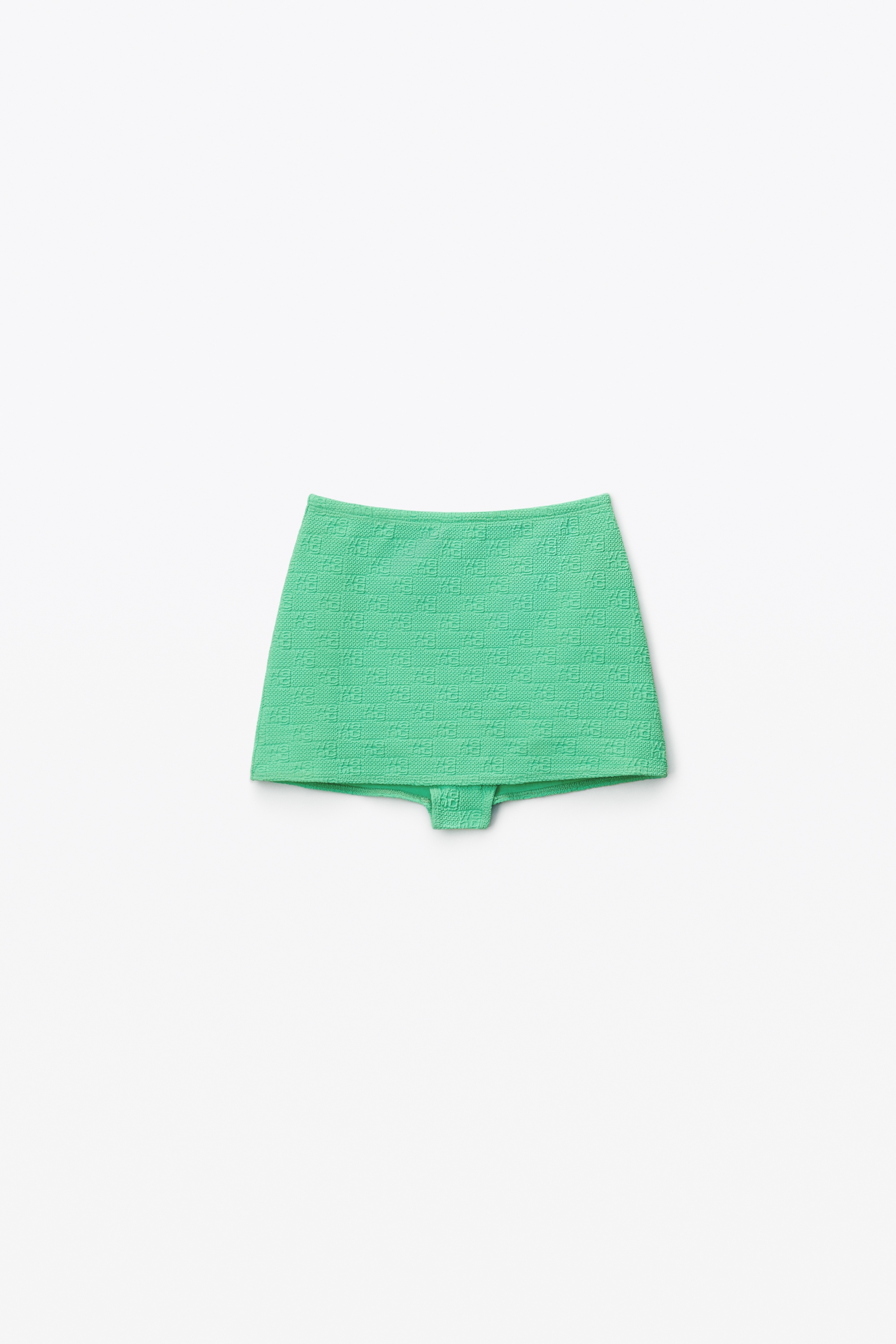high waisted mini skirt with back brief in mint julep allover logo jacquard textured jersey - bodycon fit - bottom hem hits above high thigh - unlined - can be worn as swimwear - composition: 95% polyamide / 5% elastane - made in hong kong - model is 5'10" and wears a size s - 4CC2238038347