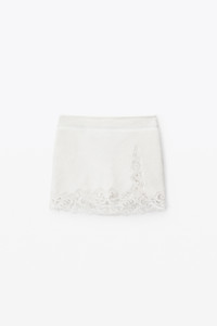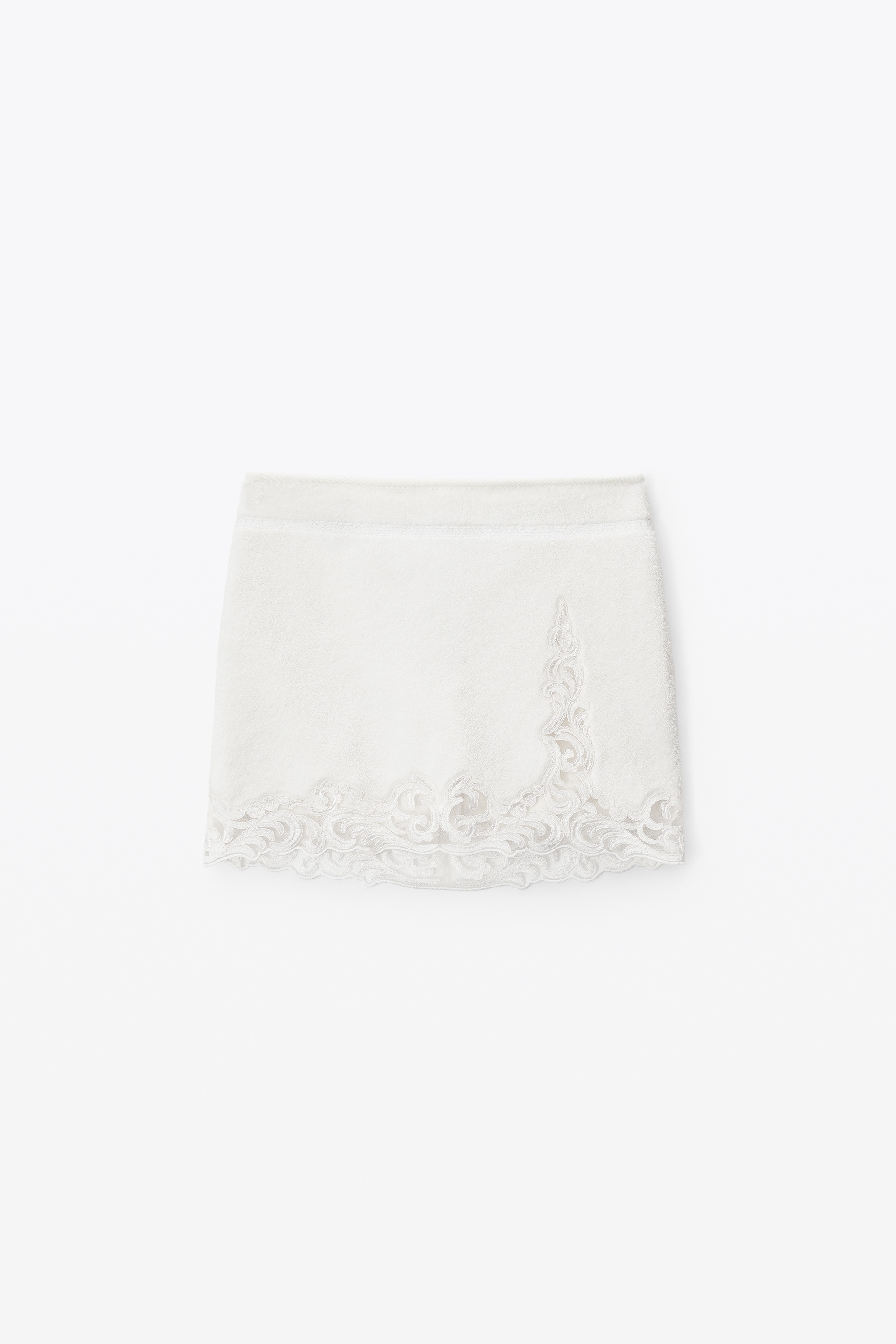 high waisted mini skirt with lace and silk embroidered hem and in white woven towel terrycloth - hem hits at high hip - window detail on leg - bound waistline - composition: 100% cotton - made in china - model is 5' 11" and wears a size 2 - 1CC3235217100