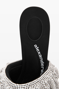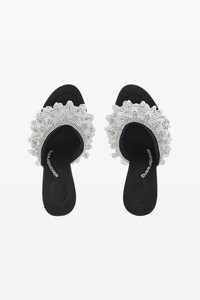 slide sandal with almond toe, tiered crystal ruffle strap, and flared high heel in black crystal - heel height: 105 mm - signature comfort footbed - leather outsole with semi-shine finish - upper: 95% crystal glass / 4% nylon / 1% spandex - lining: 85% nylon / 15% spandex - outsole: 100% cow leather - made in china - 30123S014001
