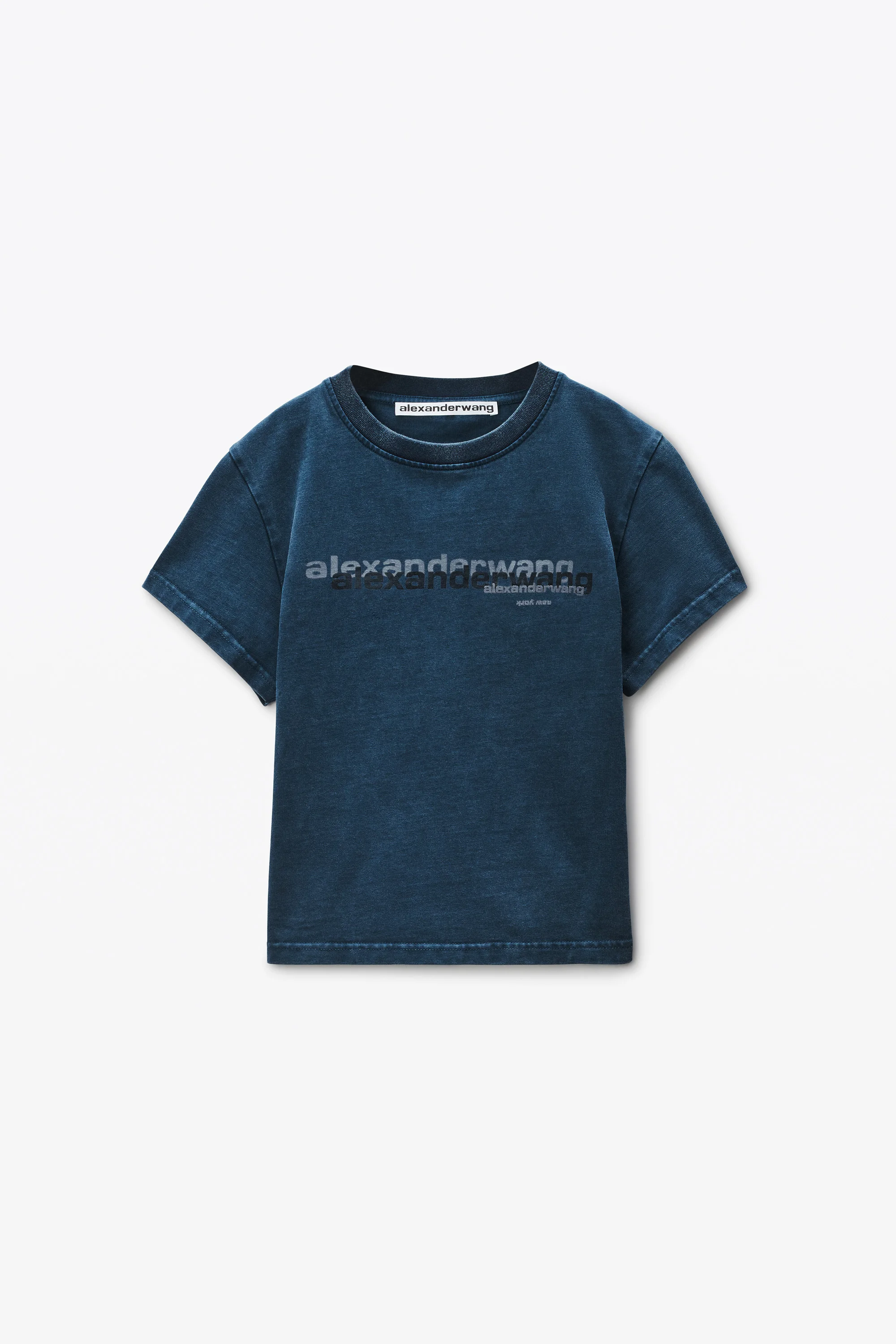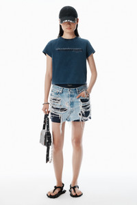 A distressed logo print with embroidered detailing defines this shrunken cotton tee in washed navy. - crewneck - short sleeves - body composition: 100% cotton - trim: 99% cotton/1% elastane - made in Portugal - model is 5'11" and wears a size s - 1CC3251103421B composition Body: 100%COTTON Rib: 99%COTTON/1%ELASTANE