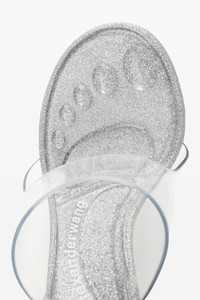 the nudie classic high-heel sandal in silver glitter with a molded clear pvc strap - heel height: 105 mm - signature comfort footbed - upper: 100% polyvinyl chloride - outsole: 100% cowhide - made in china - 30323S018046