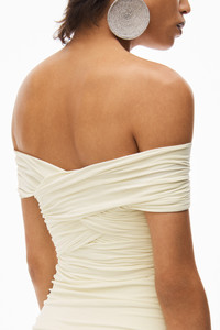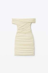 tender yellow off-shoulder interwoven mini dress with integrated shorts in light faux stretch seude - tight fit - hem hits at mid thigh - composition: 66% acetate / 25% polyester / 9% elastane - made in hong kong - model is 5'9.5" and wears a size s - 1CC1236550748
