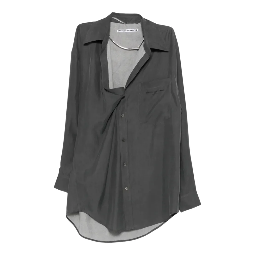 300051402GRY-XS / E61WC1266949/00/022C - Off-shoulder asymmetrical neckline - Button-front closure - Long sleeves with barrel cuffs - Chest pocket detail - Curved hem with side splits - Oversized relaxed fit - Lightweight woven construction Alexander Wang Off Shoulder Shirt Dress delivers contemporary elegance with deconstructed sophistication. Crafted from lightweight woven fabric in charcoal gray, featuring asymmetrical draping and signature oversized proportions. The off-shoulder design and elongated silhouette create a modern statement piece that bridges streetwear and luxury fashion.