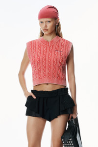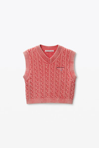 This garment-dyed acid-washed vest in bombshell reveals an enhanced high/low tonal effect; it is made of organic high-twist cotton in mid-weight for easy-to-layer comfort. A 'wang sport' logo at the chest completes this washed bombshell cropped sweater-dressing style. - V-neck - short-sleeves - pulls over - body composition: 97% cotton/2% polyamide/1% elastane - trim: 93%cotton/6%polyamide/1%elastane - made in China - model is 5'10" and wears a size s - 4KC2251045628A composition Body: 97%COTTON/2%POLYAMIDE/1%ELASTANE Rib Trim: 93%COTTON/6%POLYAMIDE/1%ELASTANE