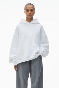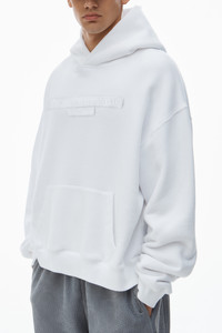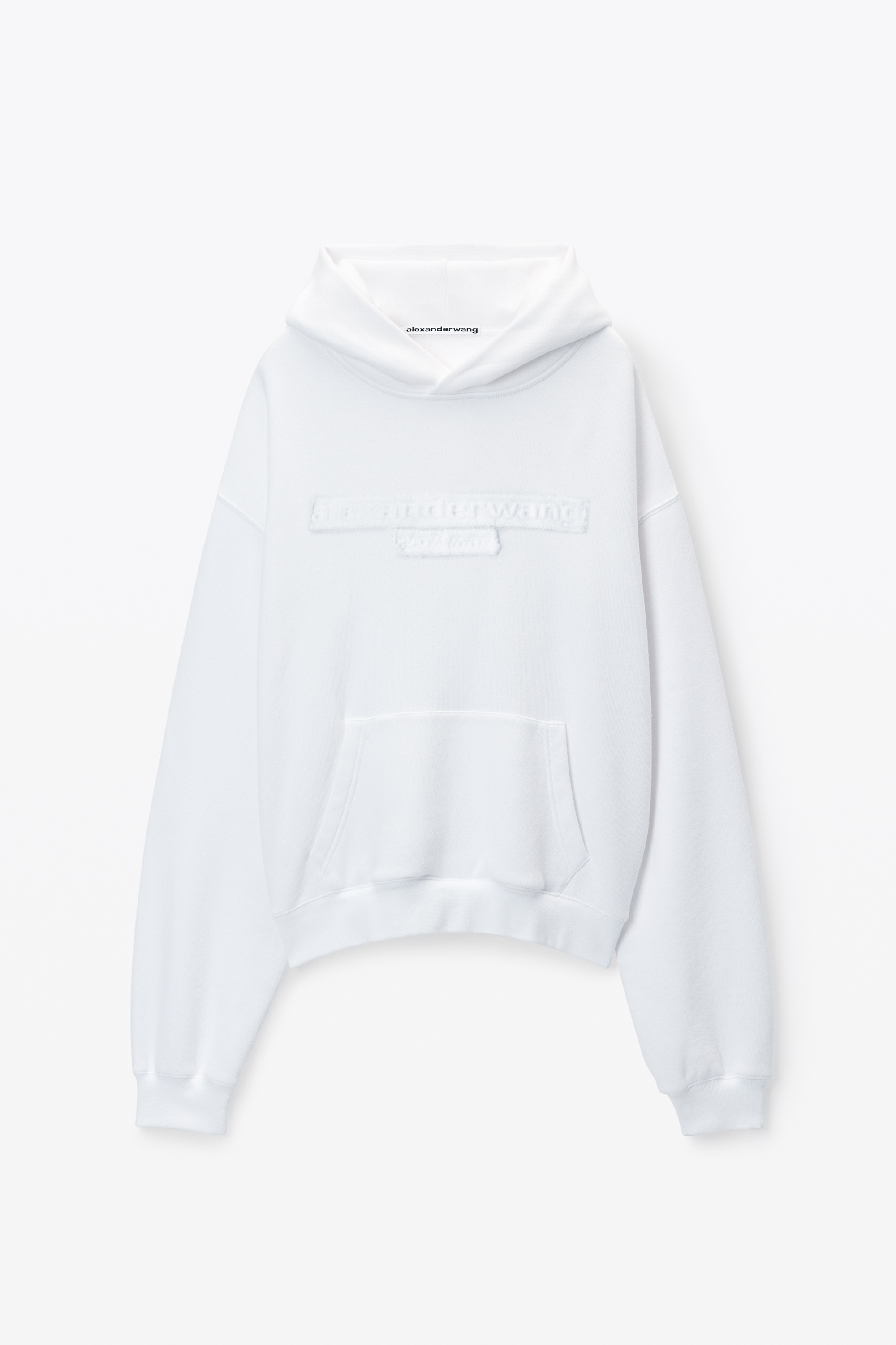 This unisex logo hoodie in white features a distressed logo applique at the chest. - crewneck - long sleeves - hits at hip - body composition: 100% cotton - trim: 99% cotton/1% elastane - female model is 5'9" and wears a size s - male model is 6'1" and wears a size m - made in china - UCC1251788100 composition Body/Exterieur: 100%COTTON Rib: 99%COTTON/1%ELASTANE