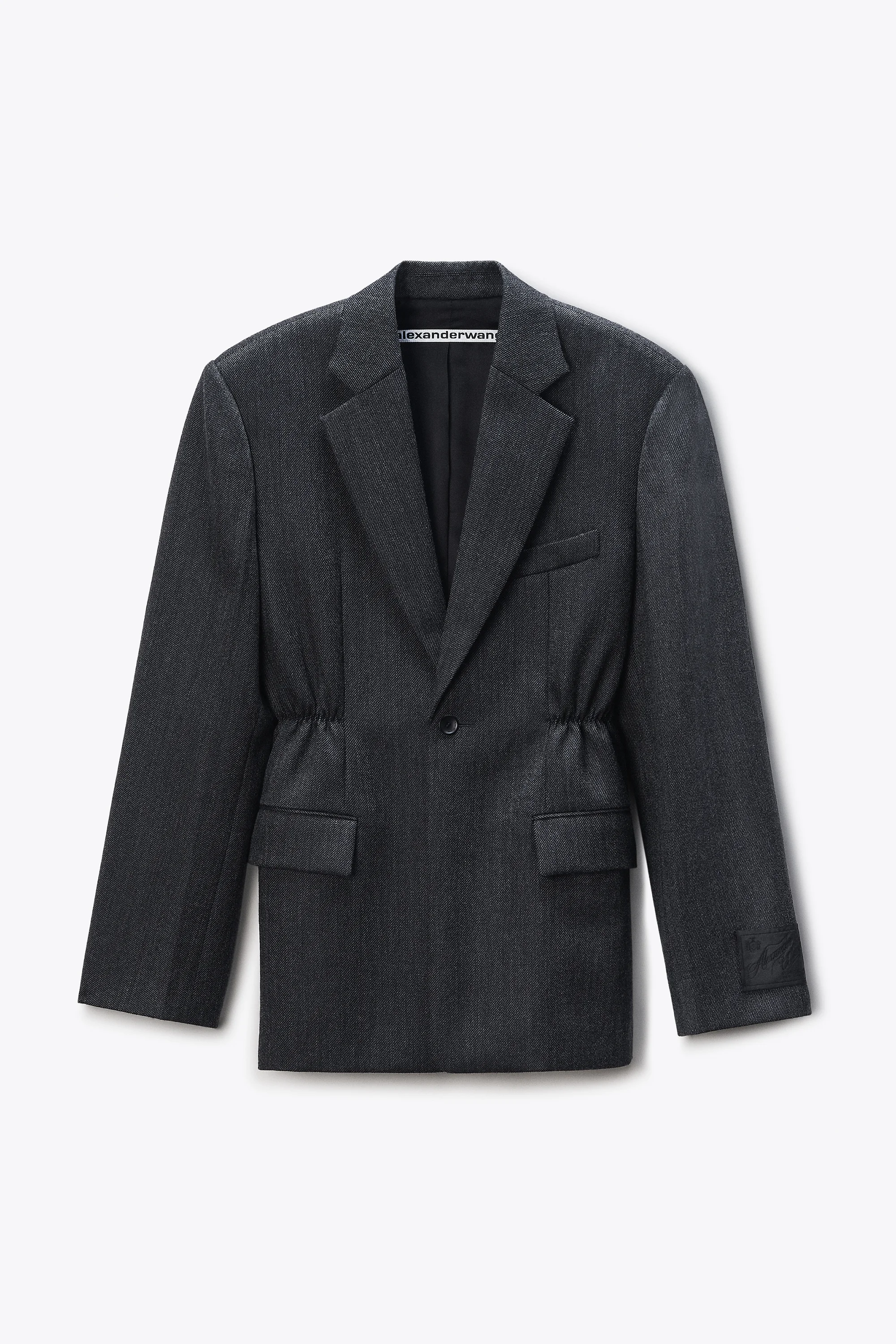 Heritage wool twill defines this oversized blazer cut with a boxy silhouette. The ruched waist with zig-zag stitching sharpens the tailoring, while a classic lapel and pocket details balance structure with ease. - Black/Charcoal - Elasticated waist with zig-zag stitching - single-welt chest pocket - two front flap hip pockets - Four-button cuffs with tailoring label - body composition: 100% wool - lining: 100% viscose - Made in China - Model is 5'11" and Wears a Size S - 1WC1262715019E composition Body: 100%WOOL (OVIS ARIES ARIES) Lining: 100%VISCOSE