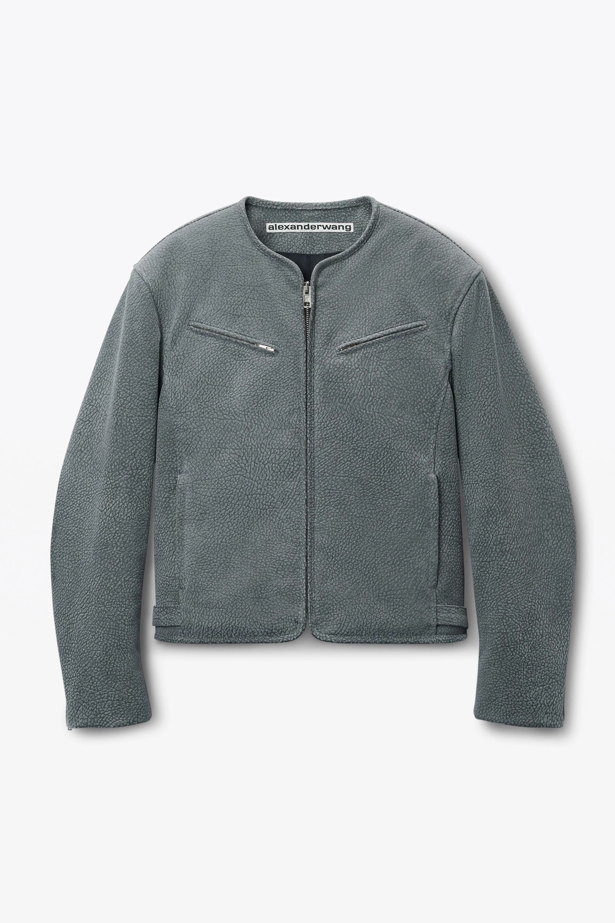 with its bubble-grain canvas construction mimicking the texture of our primal leather, this grey jacket features a boxy fit. Classic moto detailing, including front pockets, zip cuffs, a collarless design, and a front-zip closure, characterizes this silhouette. - zip closure - long-sleeves, zip cuffs - body composition: 100% cotton - material 2: 100% cotton - lining: 100% viscose - fill: 100% polyester - made in china - model is 5'10" and wears a size s - 1WC2252642020 composition Body: 100%COTTON Body Base: 100%COTTON Lining: 100%VISCOSE Filling: 100%POLYESTER