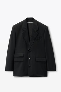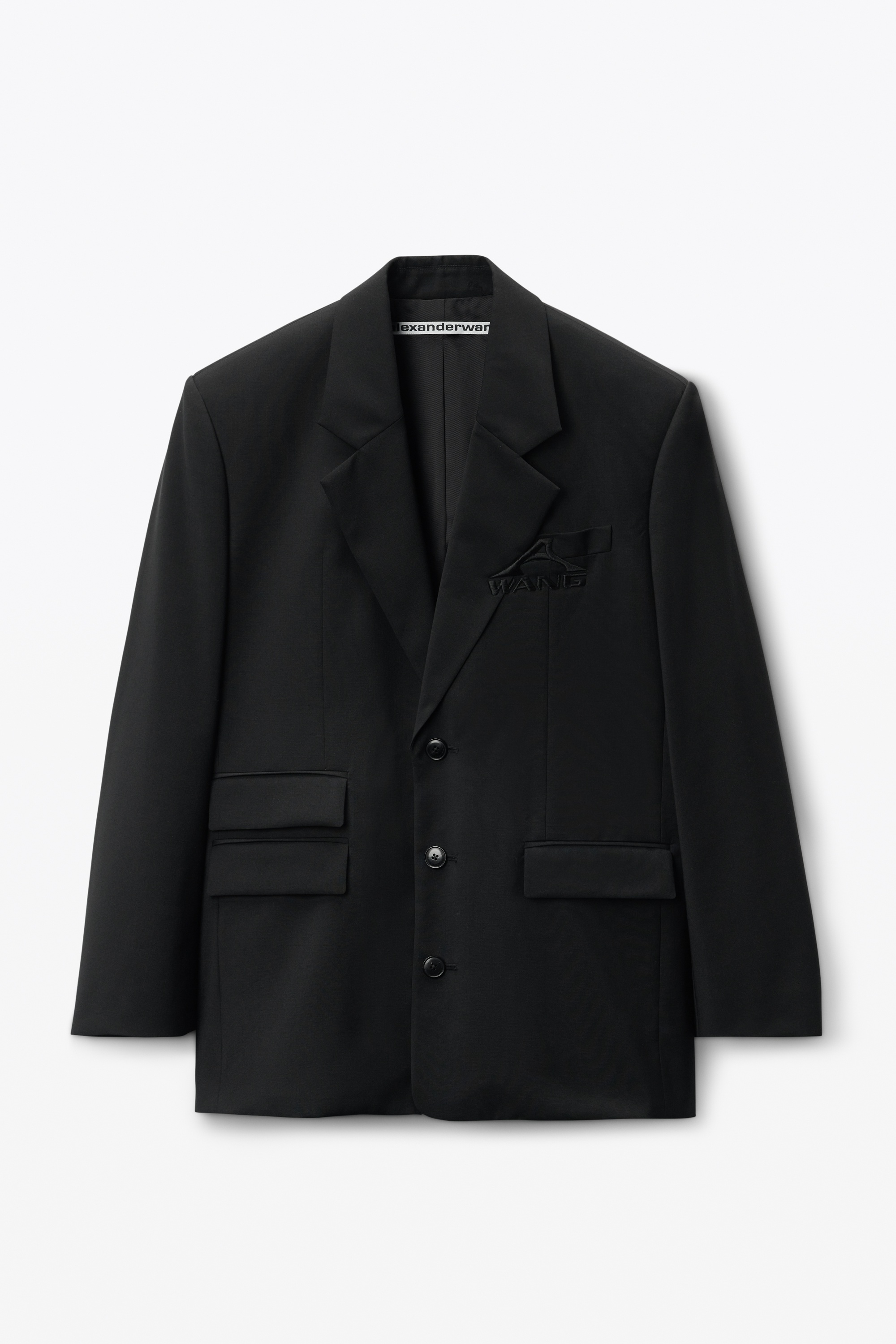 logo embroidery overlapping the notch lapel and chest offset this black blazer in a tropical wool stretch blend. The single-breasted three-button closure features ticket and front flap pockets. - notch lapel - single-breasted three-button closure - body composition: 86% wool/9% polyamide/5% elastane - three-button closure - lining: 100% viscose - trim: horn - made in china - model is 5'10" and wears a size s - 1WC2252641001 composition Body: 86%WOOL (OVIS ARIES ARIES)/9%POLYAMIDE/5%ELASTANE Body Lining: 100%VISCOSE