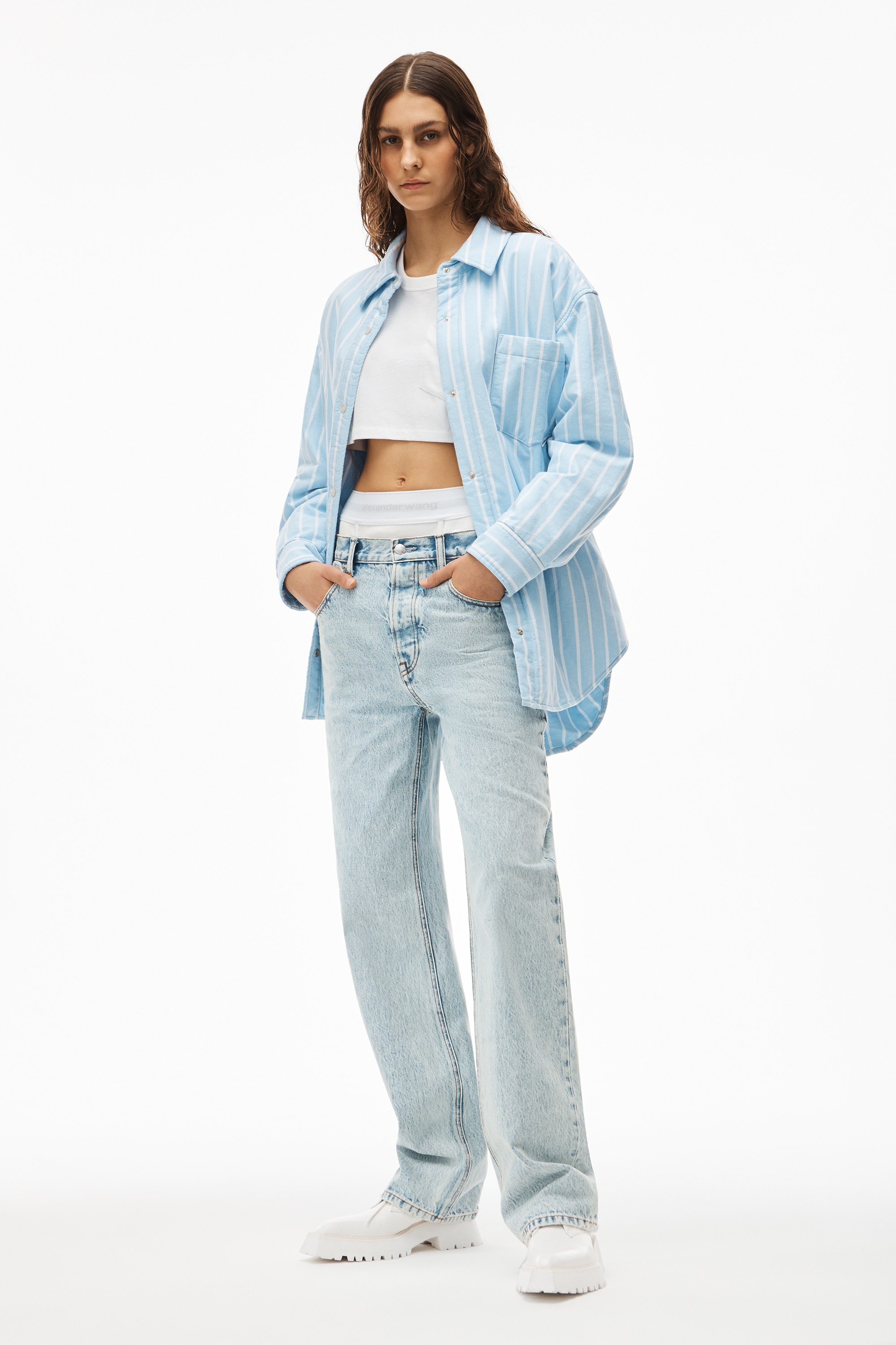 oversized long-sleeve collared puffer shirt jacket with left chest pocket and front button placket closure in light blue and white striped cotton oxford shirting - bottom hem hits at upper thighs - fully lined - model is 5'10" and wears size s - composition: 100% cotton - made in china - 4WC1222055438