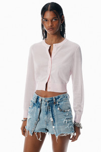 One thousand six hundred fifty crystal hotfix beads illuminate this baby pink cardigan. Its sheer jersey stitch gives the cropped layering style a slinky-soft feel, finished with a sweater-rib trim. - crewneck - button placket - relaxed fit, hits above waist - body composition: 100% viscose - trim: 77% viscose/21% polyamide/2% elastane - made in china - model is 5'10" and wears a size s - 1KC3246056104 composition Body: 100%VISCOSE Rib Trim: 77%VISCOSE/21%POLYAMIDE/2%ELASTANE