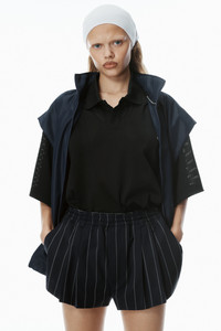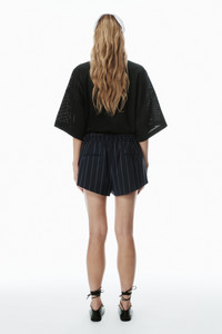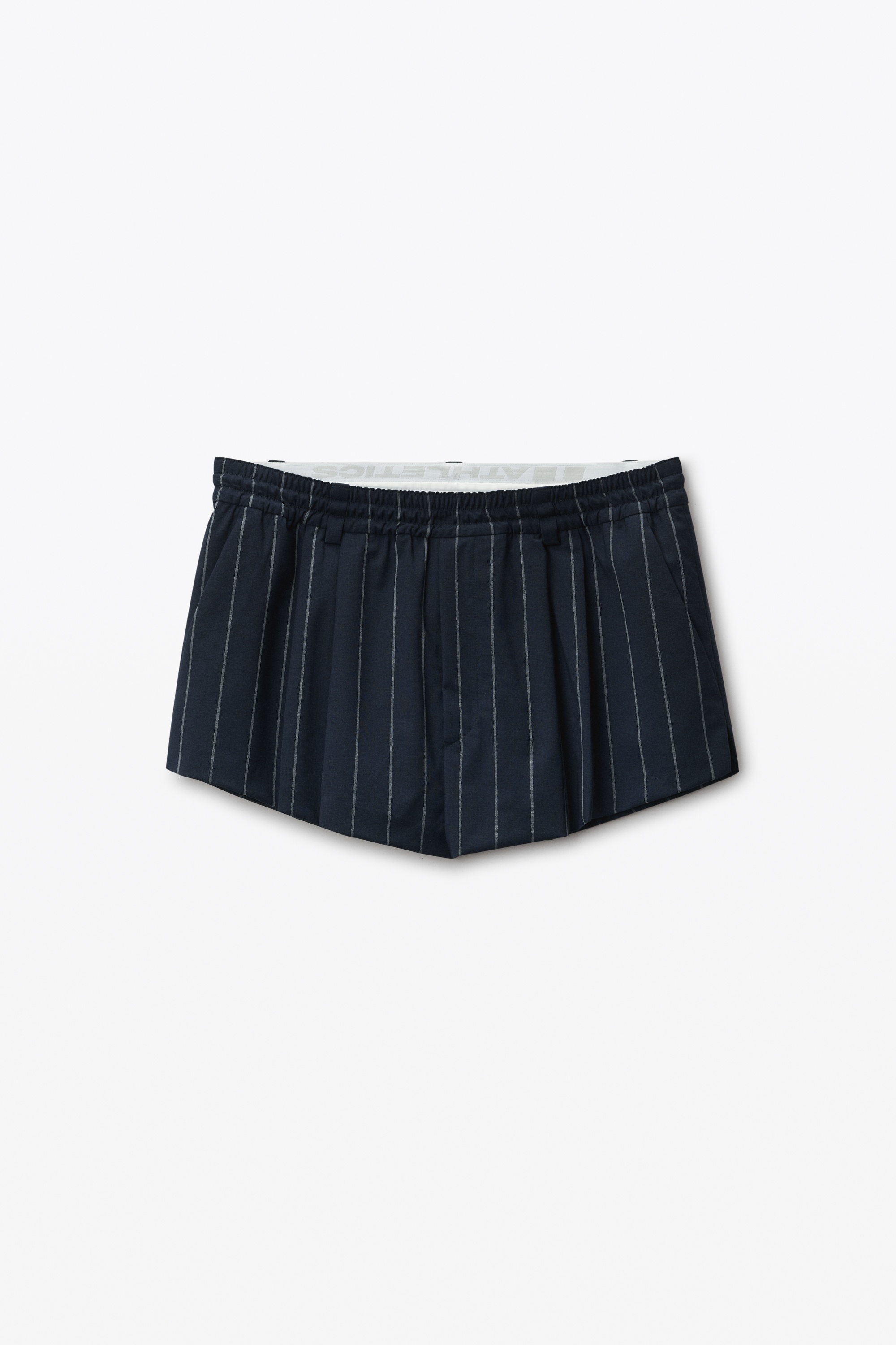 Cut in an oversized tailored silhouette with a pleated front and articulated leg; these pinstripe tropical stretch wool mini shorts feature a logo-elastic waistband on the reverse designed to be flipped over. Creased detailing lends a crisp look to this sporty style. - tailored belt loops - elastic waistband - side slash and back welt pockets - body composition: 86% wool/9% polyamide/5% elastane - lining: 100% viscose - waistband: 85% polyester/15% elastodiene - made in china - model is 5'10" and wears a size s - 1WC2254814960C composition Body: 86%WOOL (OVIS ARIES ARIES)/9%POLYAMIDE/5%ELASTANE Lining: 100%VISCOSE Elastic: 85%POLYESTER/15%ELASTODIENE