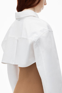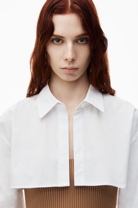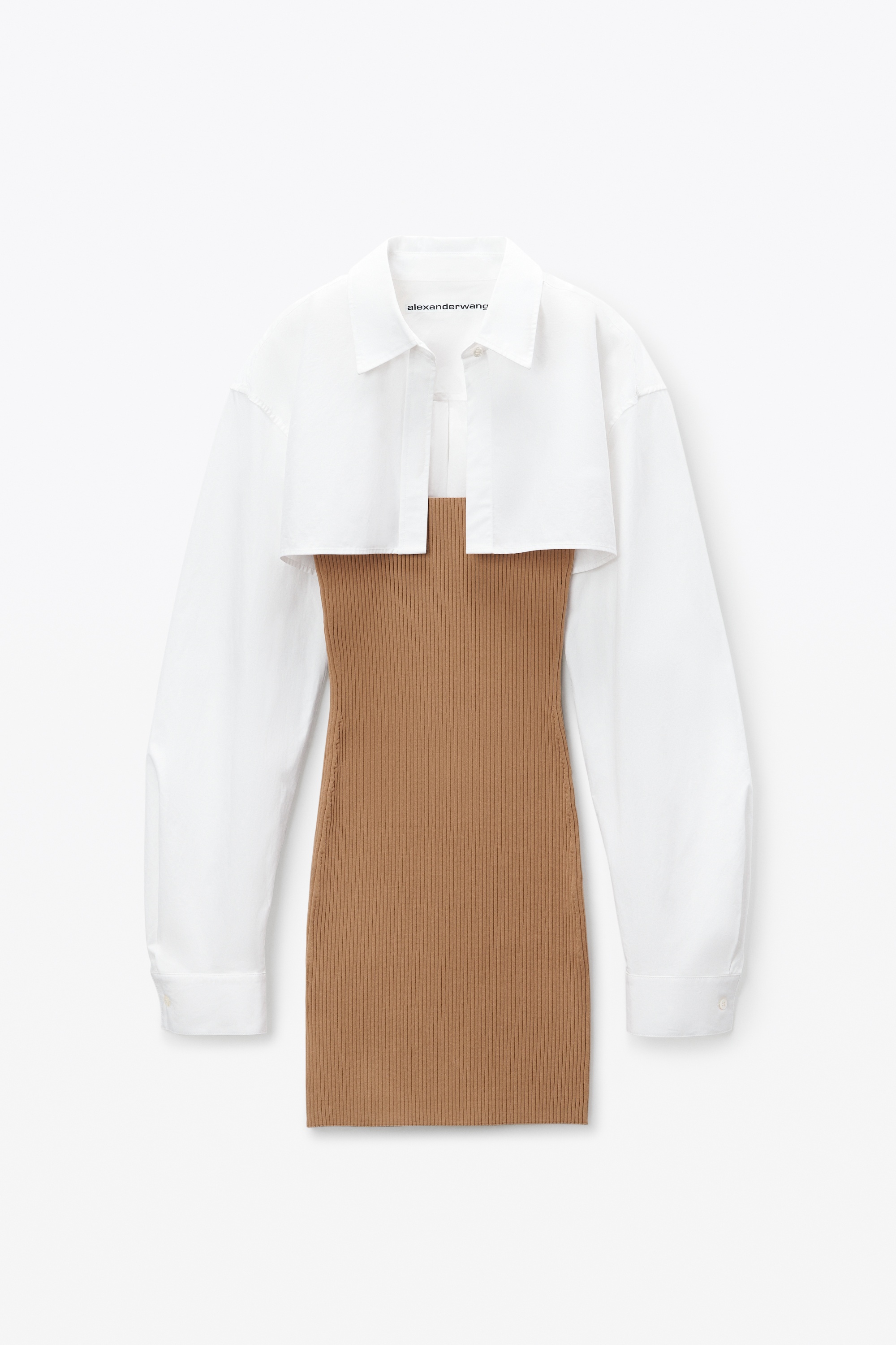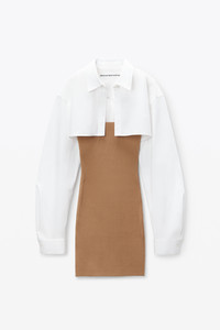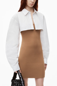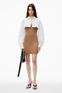 This pre-styled twinset features a cropped rib cami and a minidress with iridescent buttons. Tailored sleeves elevate this silhouette, finished with a logo at the back. - shirt collar - button cuffs - button up front - body composition: 90%polyamide/10% elastane - combo: 100% cotton - made in China - shrunken fit hits at waist - model is 5’11 and wears a size S - 1KC3246062219A composition Body: 90%POLYAMIDE/10%ELASTANE Combo: 100%COTTON