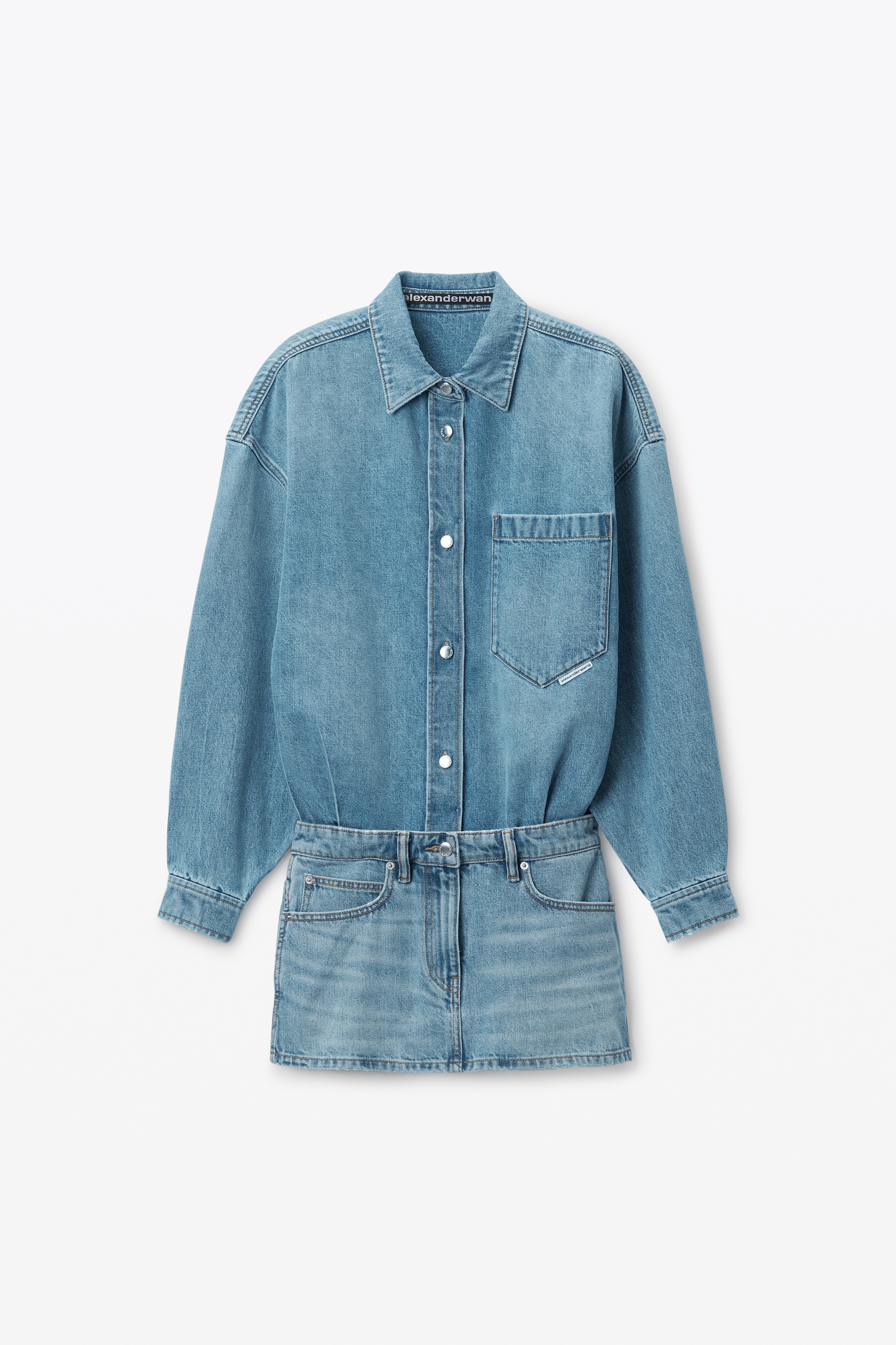this pre-styled vintage light indigo denim dress features a shirt tucked into a mini skirt, fastened by a button closure and zip fly closure. an oversized chest pocket, logo flag tag, and contrast topstitching complete this one-piece look. - snap front with zip fly and button closure - body composition: 62% cotton/23% polyamide/15% lyocell - made in china - model is 5'9" and wears a size 2 - 4dc4246429486 composition Body/Exterieur: 62%COTTON/23%POLYACTIDE/15%LYOCELL LINING: 100%COTTON