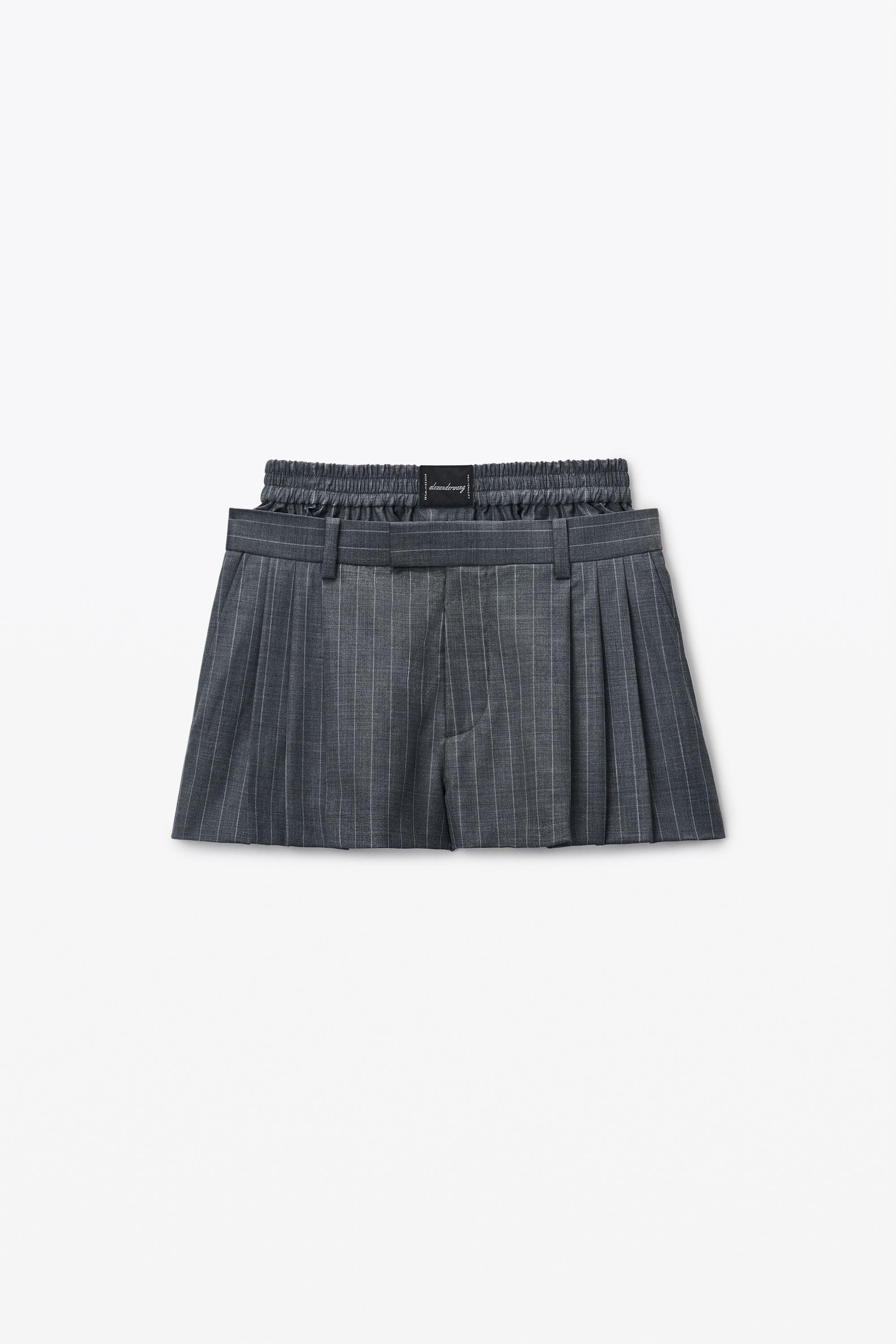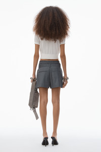This grey pinstripe wool-blend short reveals a pre-styled boxer waistband punctuated by a heritage logo tag at the front. With a pleated front, this pant is detailed with belt loops, side slack, and back welt pockets and fastened by a tab waistband with a fly front. - belt loops - tab waistband, front fly - side seam and back welt pockets fly - body composition: 86% wool/9% polyamide/5% elastane - lining: 100% viscose - made in china - model is 5’8 and wears a size 4 - 1WC1254785060B composition Body/Exterieur: 86%WOOL (OVIS ARIES ARIES)/9%POLYAMIDE/5%ELASTANE Lining: 100%VISCOSE