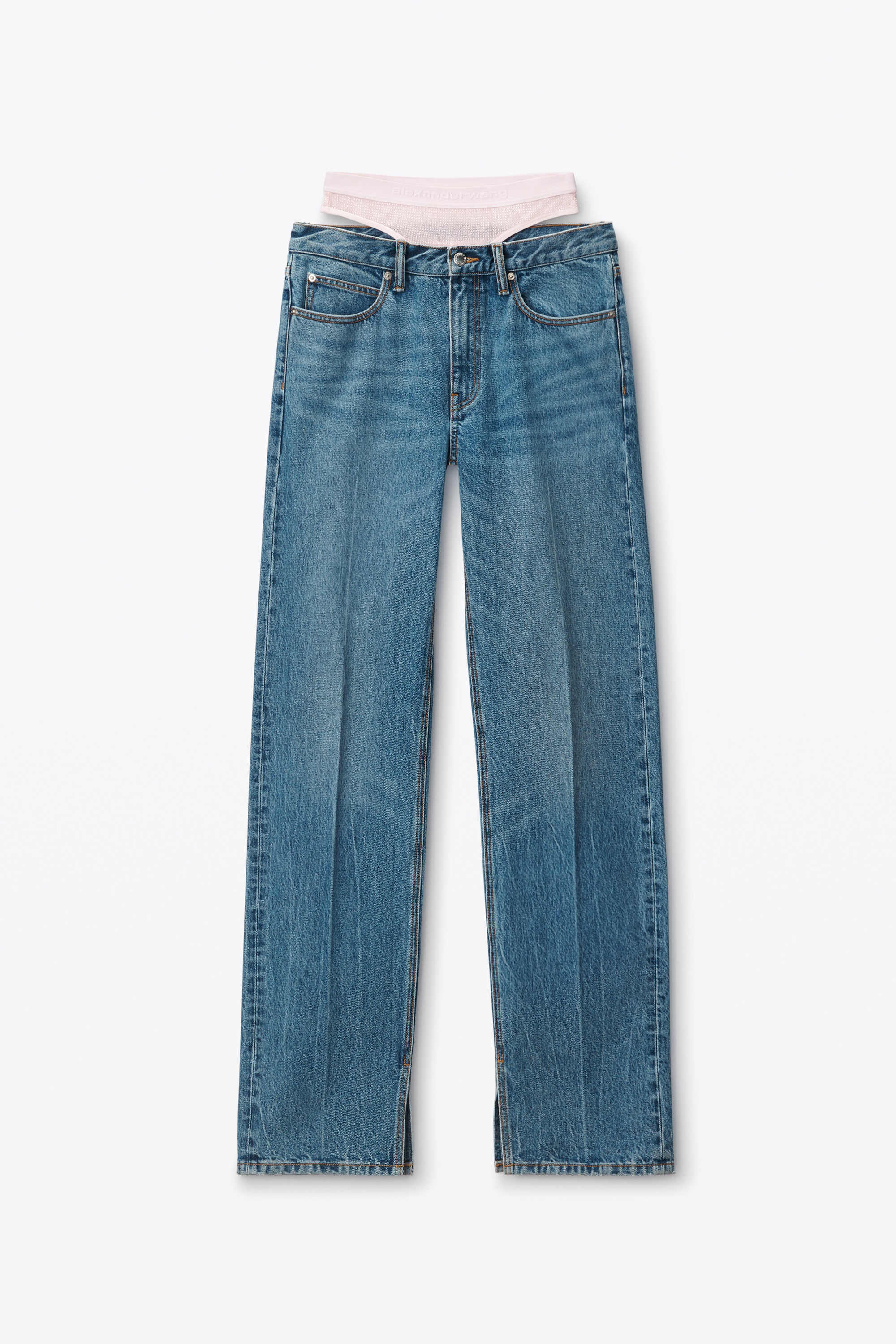 a slit hem and creased trousers elevate these indigo-wash slouchy straight-leg jeans boasting a pre-styled crystal hotfix underwear waistband in a mesh fabrication. the detachable styling element features a high-cut leg. - detachable underwear waistband - five pocket style - zip fly closure - body composition: 100% cotton - trim: 81% polyamide/19% elastane - made in china - model is 5’9.5" and wears a size 26 - 4dc4244440473 composition Body/Exterieur: 100%COTTON Combo: 81%POLYAMIDE/19%ELASTANE