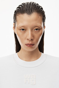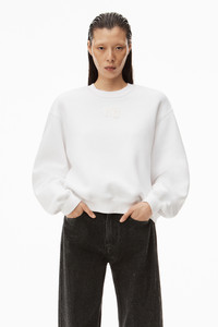 white long-sleeve crewneck sweatshirt in heavy brushed structured terry with stacked puff paint logo at neckline - relaxed fit - hip-length bottom hem - ribbed neckline, sleeeve cuffs and bottom hem - composition: cotton, polyester - made in china - model is 5'10" and wears size s - 4CC3221360100 composition Body: 75%COTTON/25%POLYESTER Rib: 99%COTTON/1%ELASTANE