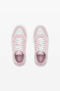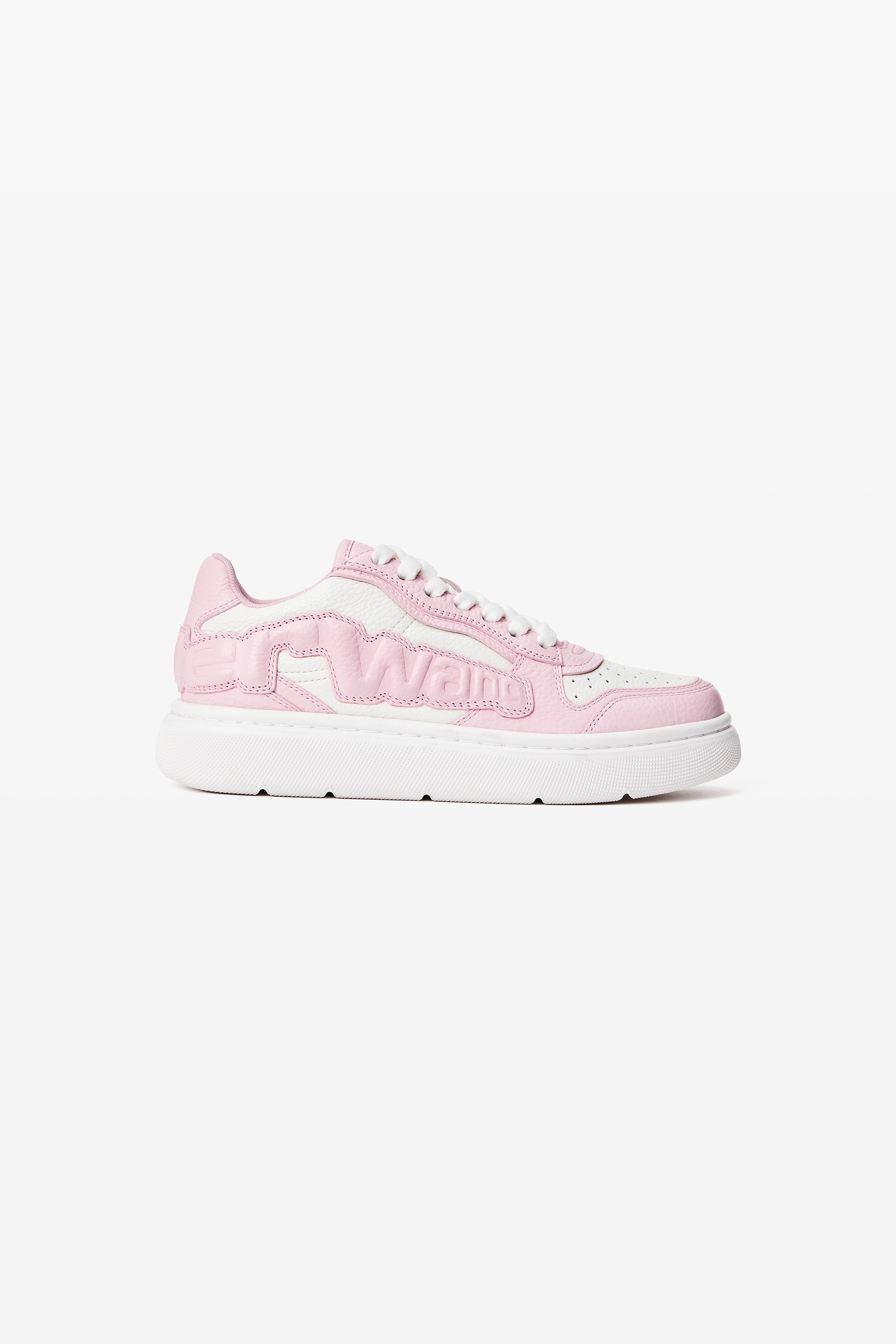 This pink and white lace-up puff pebble leather sneaker boasts an embossed logo and diamond-textured outsole. - upper: 100% cow leather - lining: 100% Polyester - outsole: 100% rubber - made in Indonesia - 30324S069972 composition UPPER: 100%COW LEATHER LINING: 100% Polyester OUTSOLE: 100% rubber