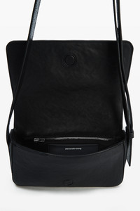 Distressed pull-up leather crossbody with a raised logo at front center. Flap secures with hidden magnets and opens to a multi-pocket interior. Finished with an adjustable strap and tonal buckles for shoulder or crossbody wear. - Black - raised tonal logo at front panel - interior front wall slip pocket and back wall zip pocket - back exterior slip pocket - black twill lining - dimensions: 21 × 4.5 × 12 cm (8.3 × 1.8 × 4.7 in) - strap length: 125.5 cm (49.4 in) at longest - Made in Vietnam - 20126X01L001 composition Body: 100%CALFSKIN Lining: 100%COTTON
