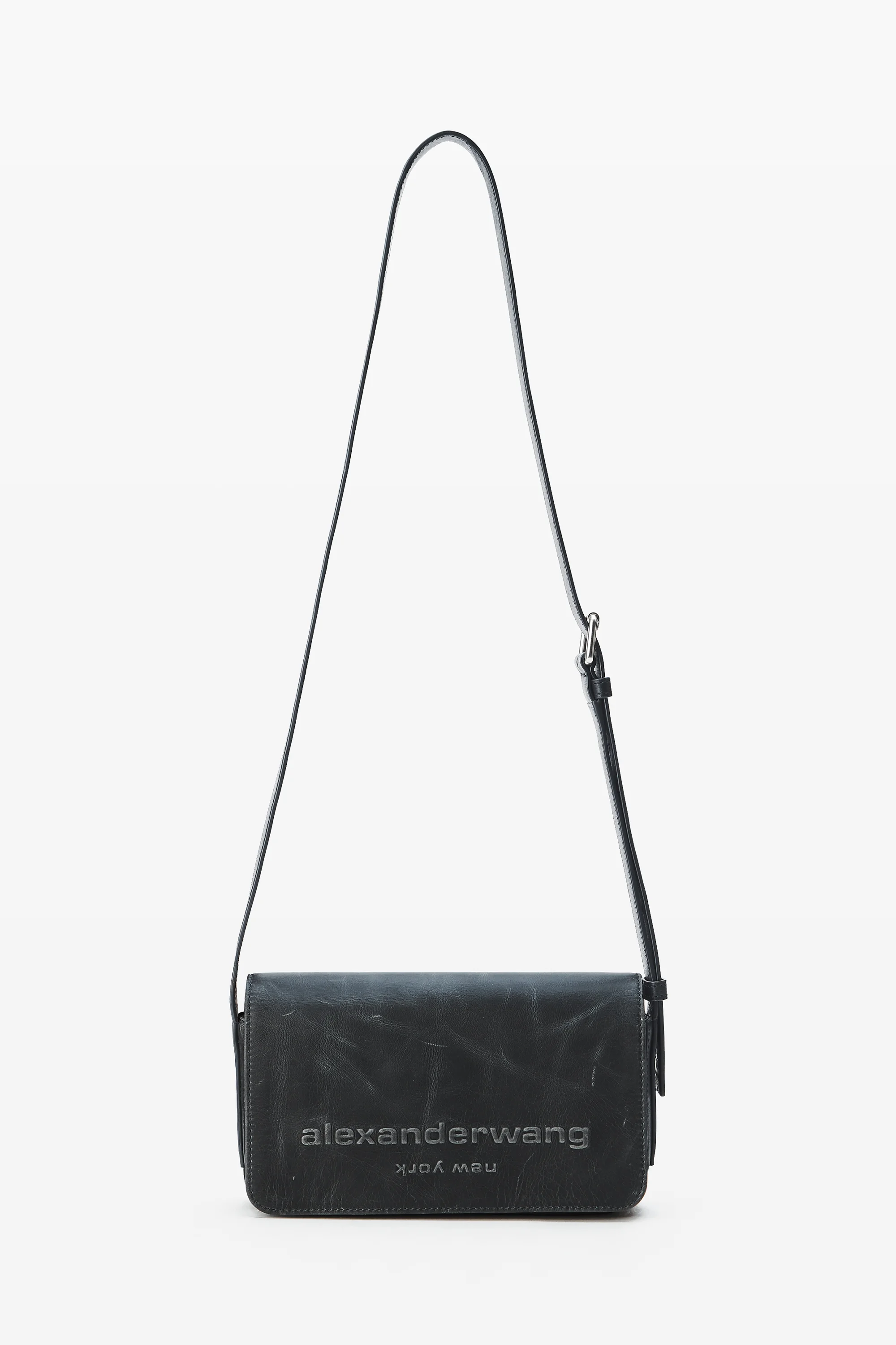 Distressed pull-up leather crossbody with a raised logo at front center. Flap secures with hidden magnets and opens to a multi-pocket interior. Finished with an adjustable strap and tonal buckles for shoulder or crossbody wear. - Grey Smoke - raised tonal logo at front panel - interior front wall slip pocket and back wall zip pocket - back exterior slip pocket - black twill lining - dimensions: 21 × 4.5 × 12 cm (8.3 × 1.8 × 4.7 in) - strap length: 125.5 cm (49.4 in) at longest - Made in Vietnam - 20126X02L038 composition Body: 100%GOATSKIN (CAPRA AEGAGRUS HIRCUS ) Lining: 100%POLYESTER