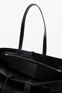 Featuring a tonal raised "alexander wang" logo at the center front—this large leather bag is crafted in crackle patent leather for a broken-in look and feel. The tote features an interior back wall pocket that fits a laptop, two large handles, and an additional tie closure at the interior top. - single main compartment - black twill lining - body composition: 100% cow leather - lining composition: 100% polyester - made in vietnam - 20224T01L001 composition Body/Exterieur: 100%COW LEATHER Lining 1/Doublure 1: 100%POLYESTER