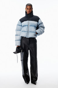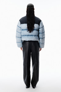 Cropped trompe l’oeil puffer jacket in light distressed blue/black technical nylon with a denim-inspired finish. Features a stand-up collar, dropped shoulders, front zip closure with zipper guard, and contrast yoke panels at front and back. Includes welt pockets with hidden snaps, elasticated cuffs, tonal chest logo embroidery, and an adjustable bungee hem for customizable fit. - stand collar - welt pockets with hidden snap closures - elasticated cuffs - front-zip closure with guard - bungee hem - body composition: 54% polyester / 46% polyamide - model is 5'11" and wears a size s - made in China - 1WC4253293423B composition Body: 54%POLYESTER/46%POLYAMIDE Body 2: 54%POLYESTER/46%POLYAMIDE Lining: 100%NYLON Filling: 75%DOWN/25%FEATHER Filling 2: 100%POLYESTER