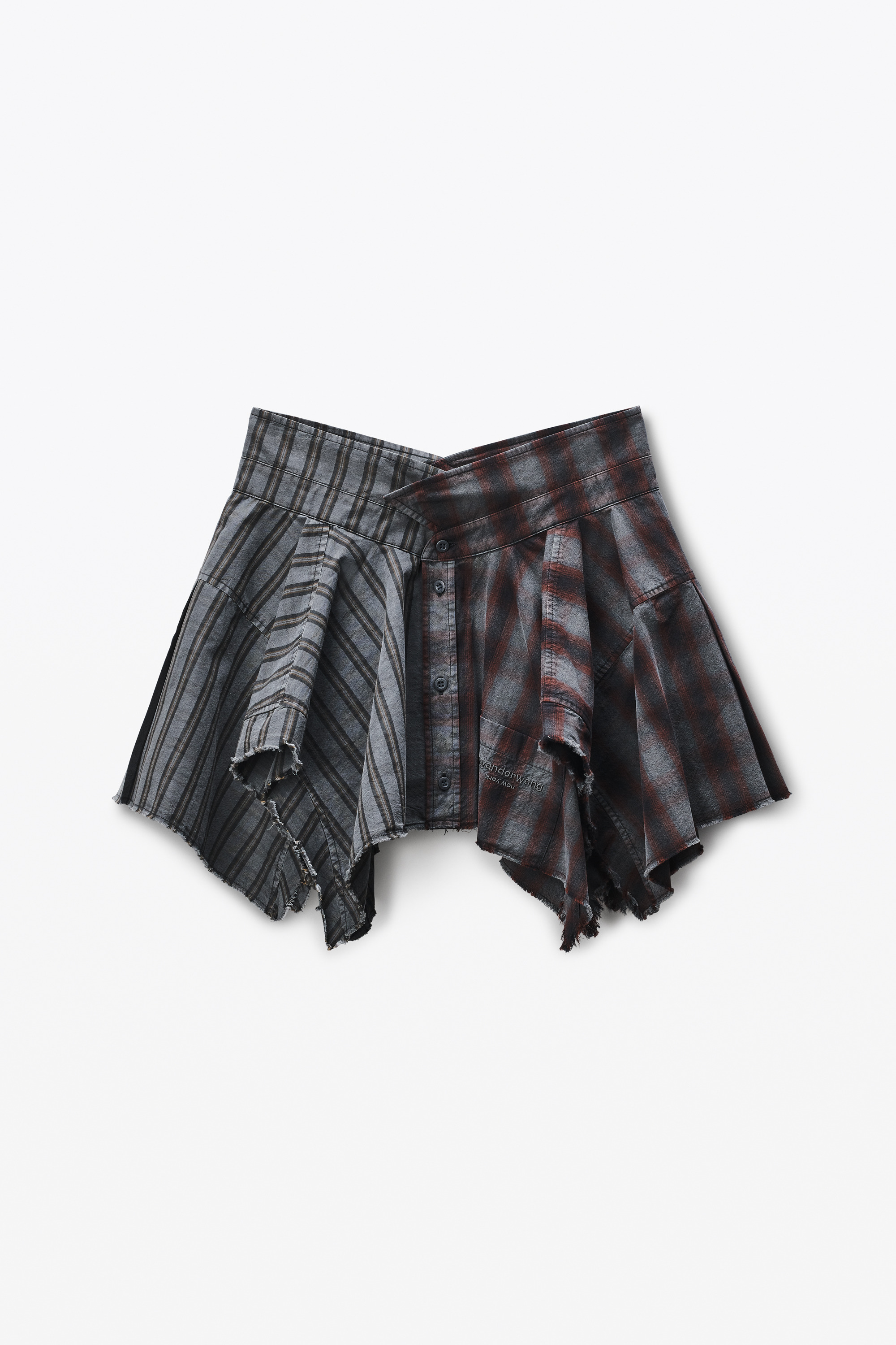 Defined by a high-low raw-finished hem, this smog red and grey mid-rise miniskirt features turned-up collars that create a 'V' shape at the front. - patch pockets - body composition: 100% cotton - made in china - model is 5’11" and wears a size 4 - 1WC3255340936 composition Body: 100%COTTON Body 2: 100%COTTON