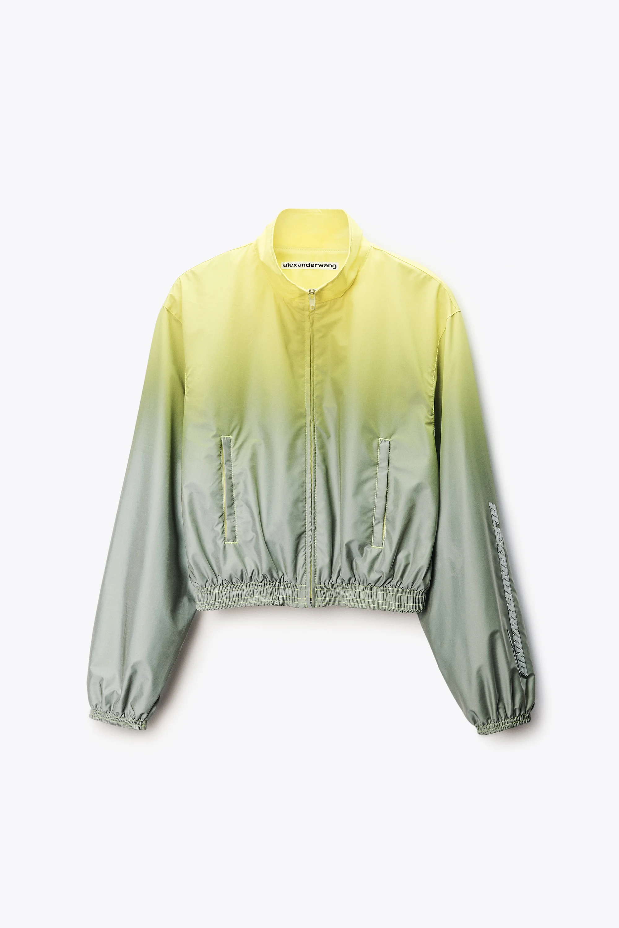 Silver-yellow shrunken track jacket in reflective gradient fabrication. Cut with a slightly relaxed body and drop shoulder, the silhouette reimagines athletic codes with a high-shine finish. - Silver/Yellow - Stand collar - Front-zip closure - Welt zip side pockets - Adjustable bungee hem - Fully lined - body composition: 100% polyester - Lining: 100% polyester - Model is 5'11" and Wears a Size S - Made in China - 1WC1262709757 composition Body: 100%POLYESTER Lining: 100%POLYESTER