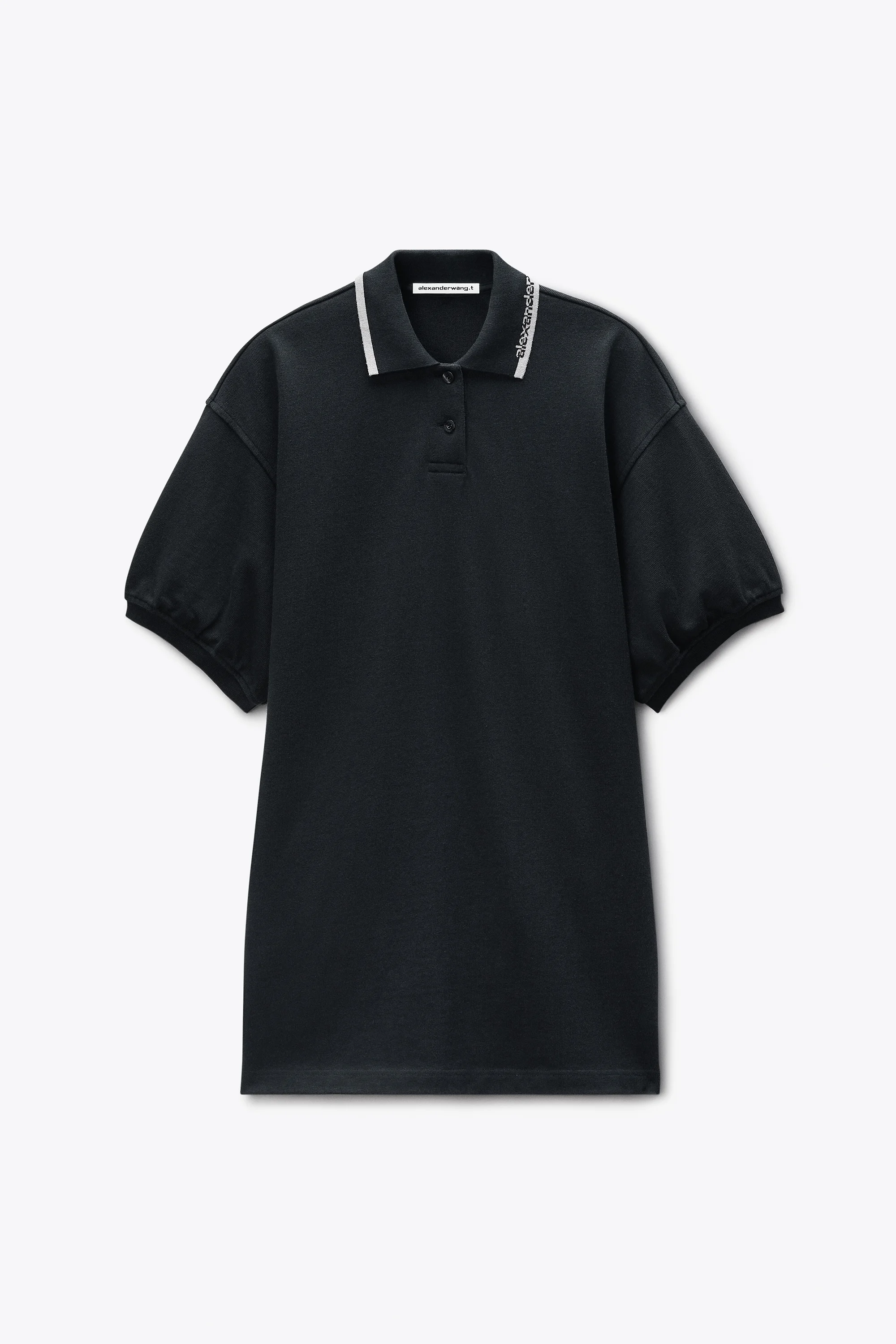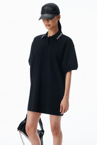 Black papery Japanese jersey mini dress in a polo silhouette. Features an engineered knit collar with contrast logo, a button placket at the neck, and a slightly oversized body with blouson sleeves finished in rib cuffs. Unlined for an airy, easy drape. - Black - Engineered knit collar - blouson sleeves - button placket - slightly oversized fit - hits at thigh - Body composition: 100% cotton - trim: 84% cotton/14% polyester/2% elastane - made in china - model is 5'11" and wears a size s - 4CC1266902001 composition Body: 100%COTTON Rib Trim: 84%COTTON/14%POLYESTER/2%ELASTANE