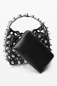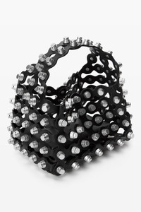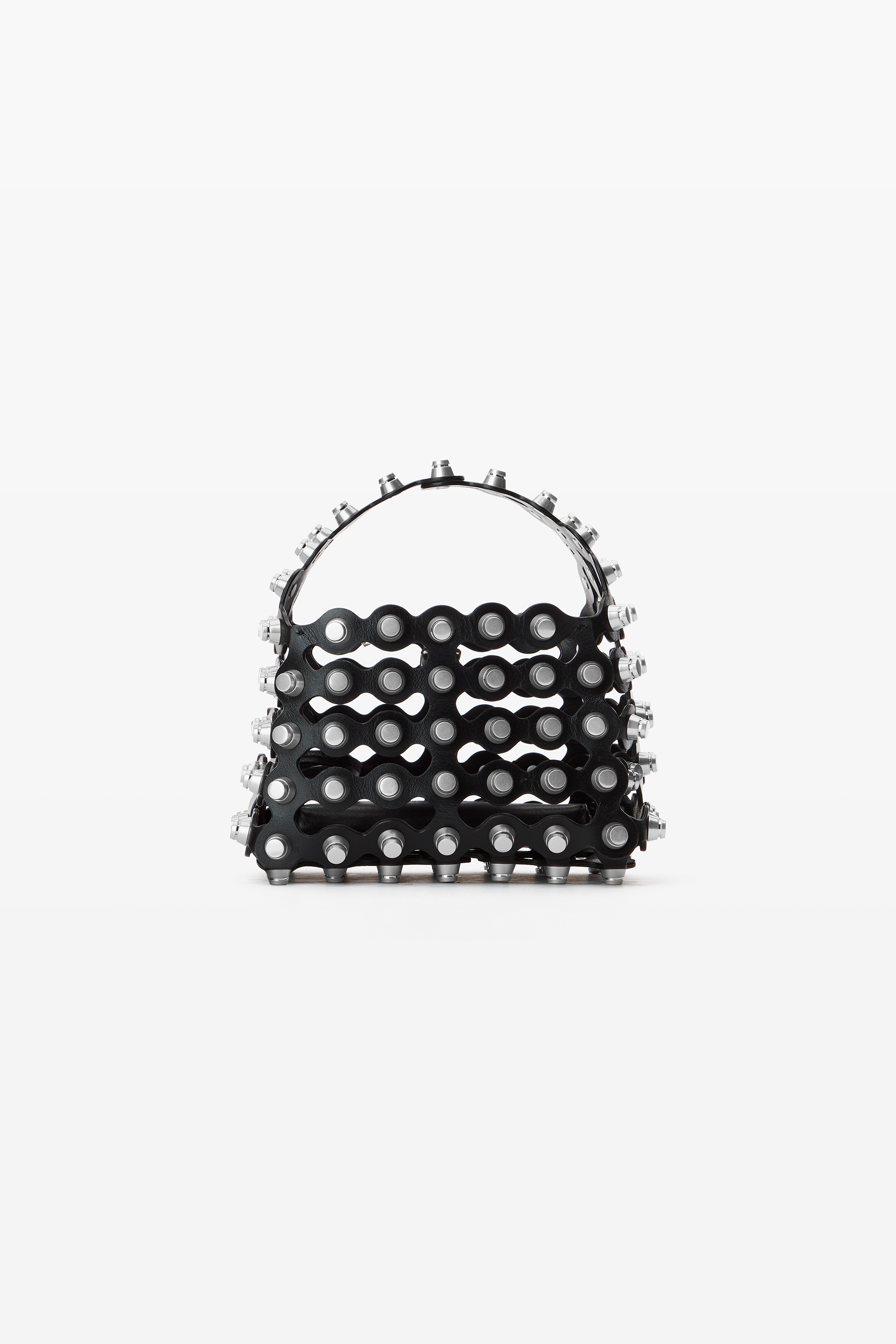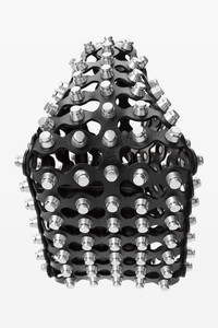 trap studs define this pyramid-shaped rex mini bucket bag in black. a fixed top handle and removable strap with a logo-rolled adjusted buckle allows for maximum versatility. - top handle - magnetic closure - main compartment, logo jacquard lining - body composition: cow leather - lining: polyester - trim: aluminum - dimensions: 21x13 x15cm / 8.3x5.1x5.9in - handle drop: 10.5cm / 4.1in - detachable adjustable crossbody strap - long strap length: 146cm / 57.5in - made in Vietnam - 20225R62L001 composition Body: 100%COW LEATHER Embellishment: 100%ALUMINUM Lining 1: 100%POLYESTER