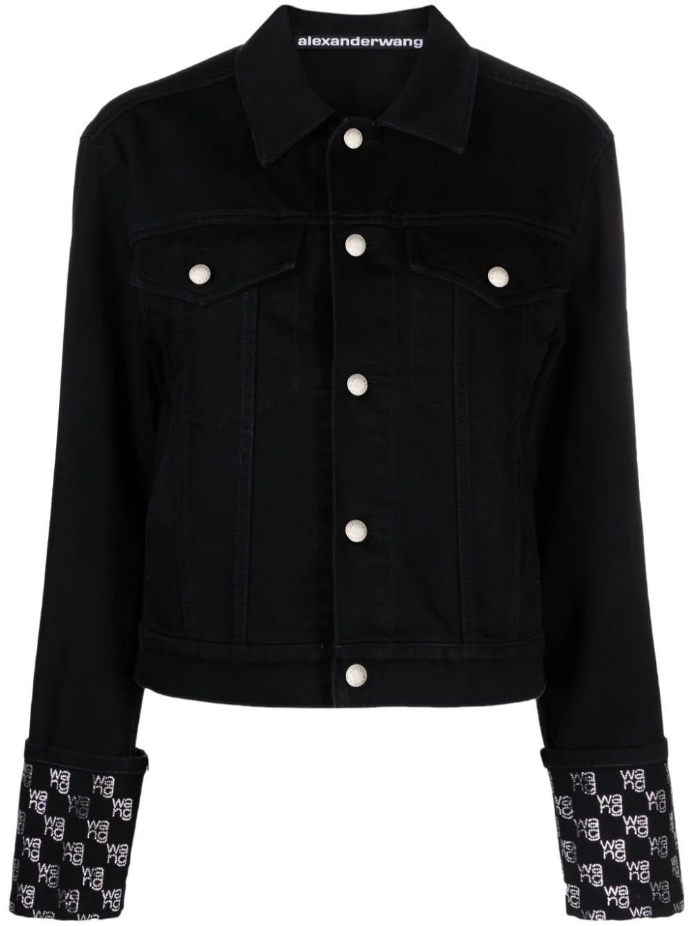 rhinestone-logo denim jacket Highlights - Black - Cotton - Denim - Rhinestone embellishment - Logo-print at the cuffs - Logo patch to the rear - Spread collar - Front button fastening - Long sleeves - Turn-up cuffs - Button-fastening chest pocket - Two side inset pockets - Straight hem Imported Composition Cotton 100% SIZE & FIT Model measurements Height 5 ft 10 in(1.78 m) Bust/Chest 31.49 in(80 cm) Hips 35.03 in(89 cm) Waist 23.62 in(60 cm) Measurement SLEEVE LENGTH 22.83 in(58 cm) LENGTH 20.47 in(52 cm) WAIST 34.64 in(88 cm) BUST 31.49 in(80 cm) FittingInformation Designed for a relaxed fit, this piece allows for comfort and movement when worn The adjustable tabs allow for fitted preferences Sturdy and hard-wearing, this denim piece offers no stretch This piece fits true to size – take your usual size Washing instructions Dry Clean Only