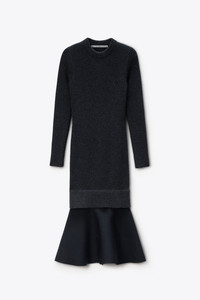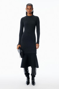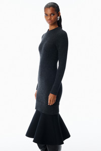 charcoal boiled wool rib knit cut into a fitted long-sleeve dress with a crew neckline. finished with a flared hem shaped by technical knit construction, it creates a sculpted, body-conscious silhouette. - Charcoal - long sleeves in rib knit - seamless interlock knit skirt panel - gathered ribbed construction for sculpted shape - flared hem - body composition: 96% wool / 3% polyamide / 1% elastane - body 2: 78% polyester / 19% polyamide / 3% elastane - Made in China - Model is 5'11" and Wears a Size S - 1KC1266013010 composition Body 1: 96%WOOL (OVIS ARIES ARIES)/3%POLYAMIDE/1%ELASTANE Body 2: 96%WOOL (OVIS ARIES ARIES)/3%POLYAMIDE/1%ELASTANE Body 3: 78%POLYESTER/19%POLYAMIDE/3%ELASTANE