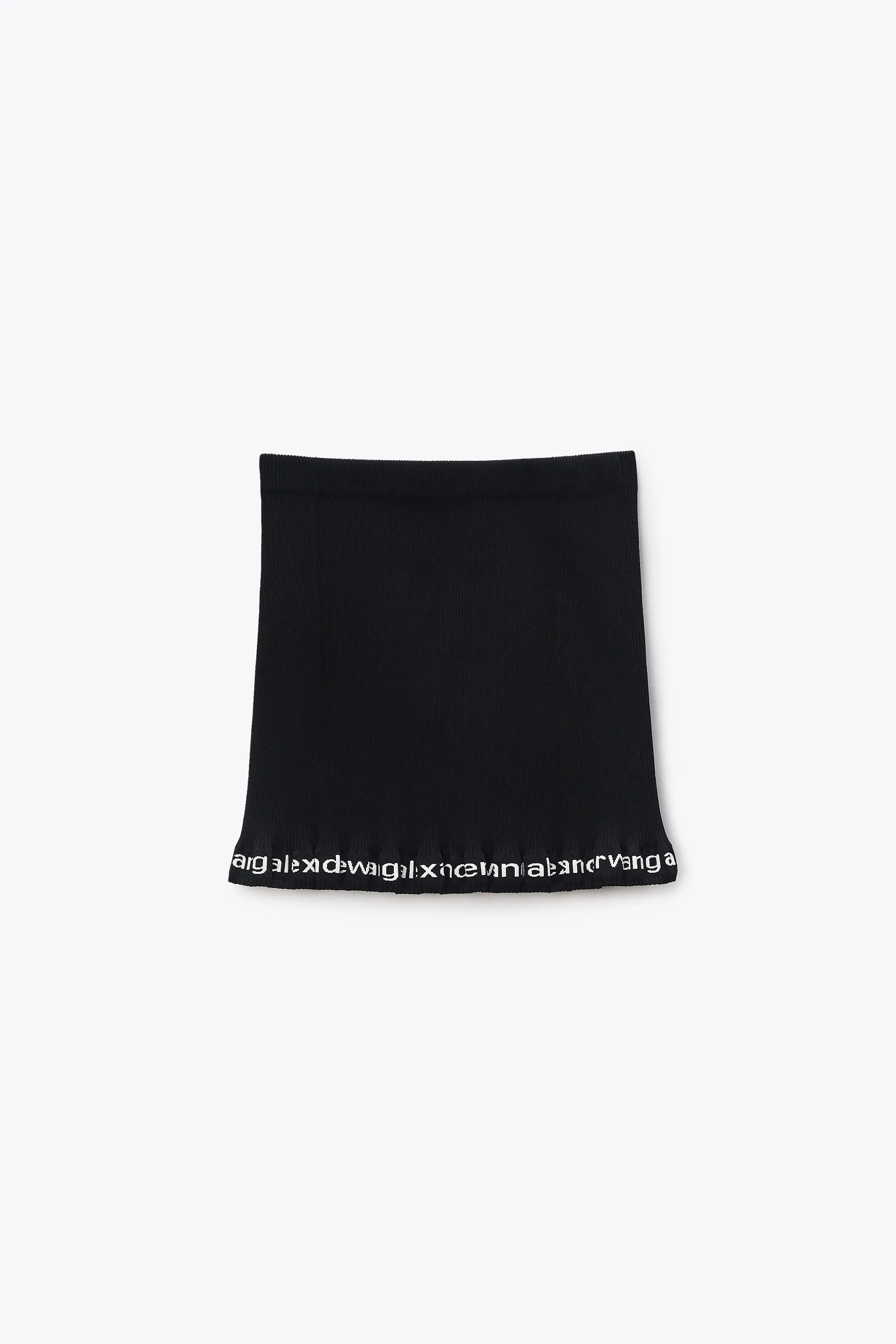 Black ribbed mini skirt in fine compact nylon. Designed with integrated contrast logo trim that ruffles at the hem for subtle texture and shape. - Black - Pull-on waistband - Ruffled logo trim hem - Body composition: 88% Polyamide/12% Elastane - trim: 88% Polyamide/12% Elastane - Made in China - Model is 5'11" and Wears a Size S - 4KC1265047001 composition Body: 88%POLYAMIDE/12%ELASTANE Rib Trim: 88%POLYAMIDE/12%ELASTANE
