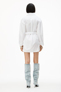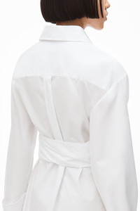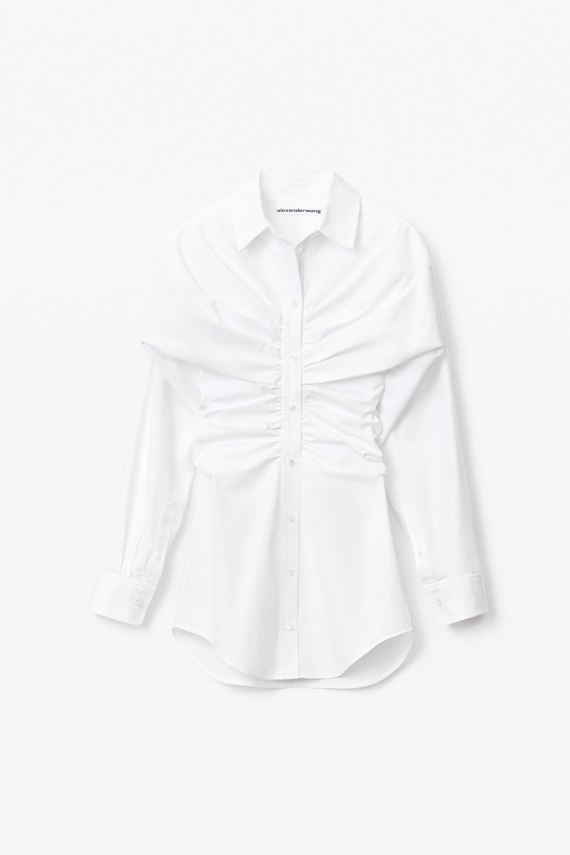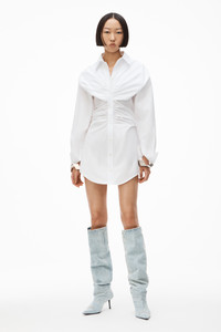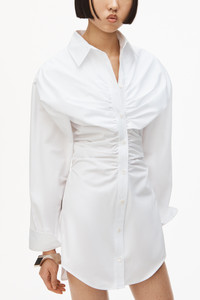 long-sleeve collared shirt dress with fitted ruched bust and waist and draped cummerbund back in white cotton poplin - bottom hem hits at upper thighs - button placket front closure - unlined - composition: 100% cotton - made in china - model is 5'10" and wears size 2 - 1WC2226465100