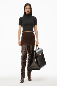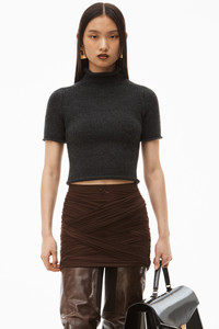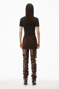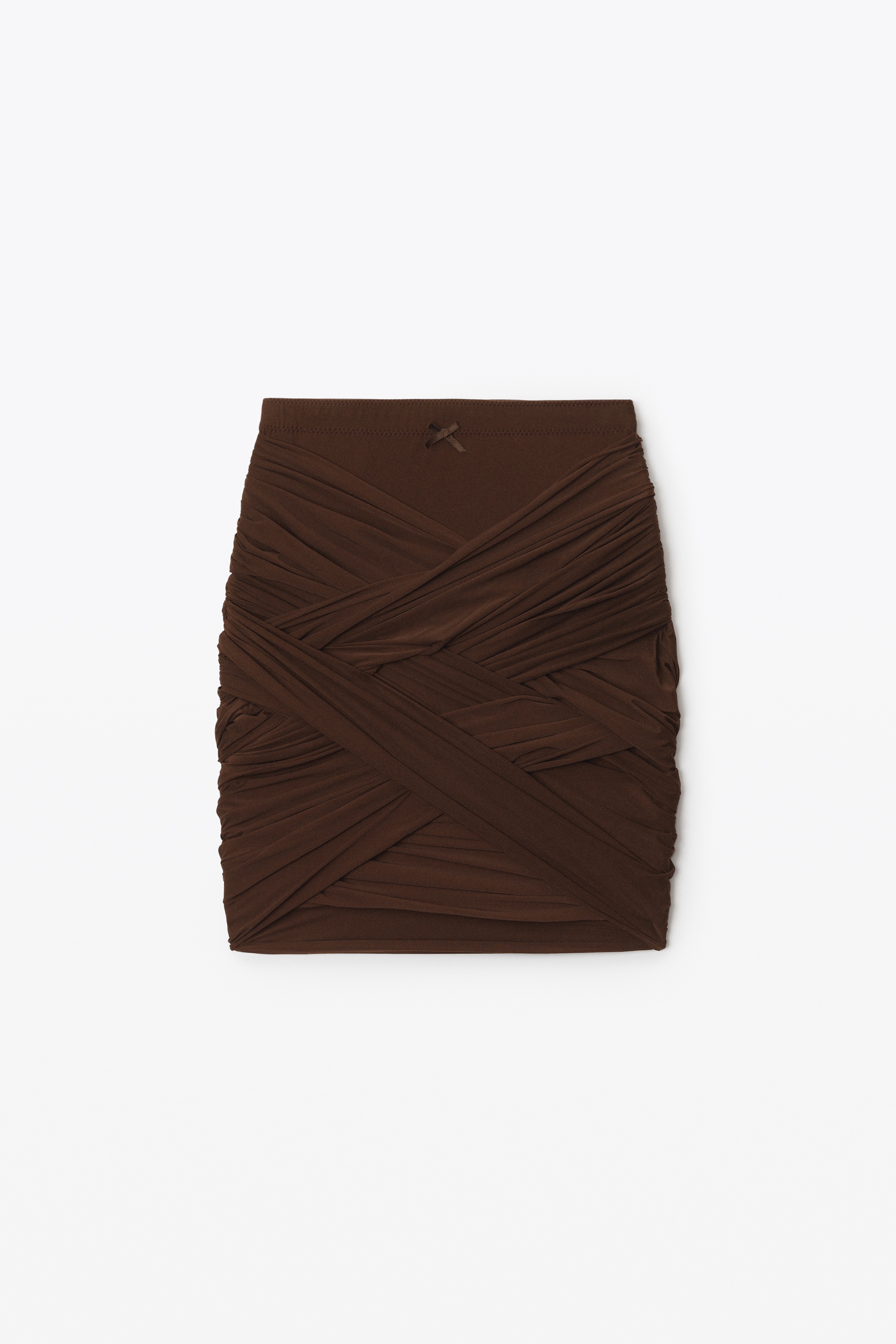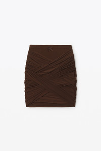 brunette high-waisted mini skirt with draped interweaving from bottom hem to waist in textured stretch jersey - tight fit - bottom hem hits at high thigh - elastic waistband and integrated shorts - composition: 72% polyamide / 28% elastane - made in china - model is 5'9" and wears size 2 - 1CC4225243209 composition 72%POLYAMIDE/28%ELASTANE