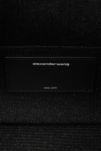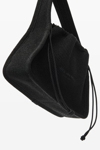 black dustbag-inspired satchel with drawstring top closure and printed logo across front in engineered metallic rib knit - dimensions: 25 x 19 x 8 cm - fixed length handle - one main compartment - composition: 54% polyester / 24% nylon / 22% metallic - made in china - 20123K60T001