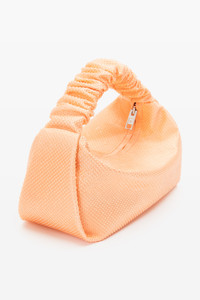 mini bag with 80s scrunchie inspired cinch handle and allover clear hotfix crystal in faded neon orange satin - top zipper closure - black twill lining - dimensions: 21 x 12 x 11 cm - composition: 60% crystal glass / 40% polyester - lining: 100% polyester - made in vietnam - 20323R40T828