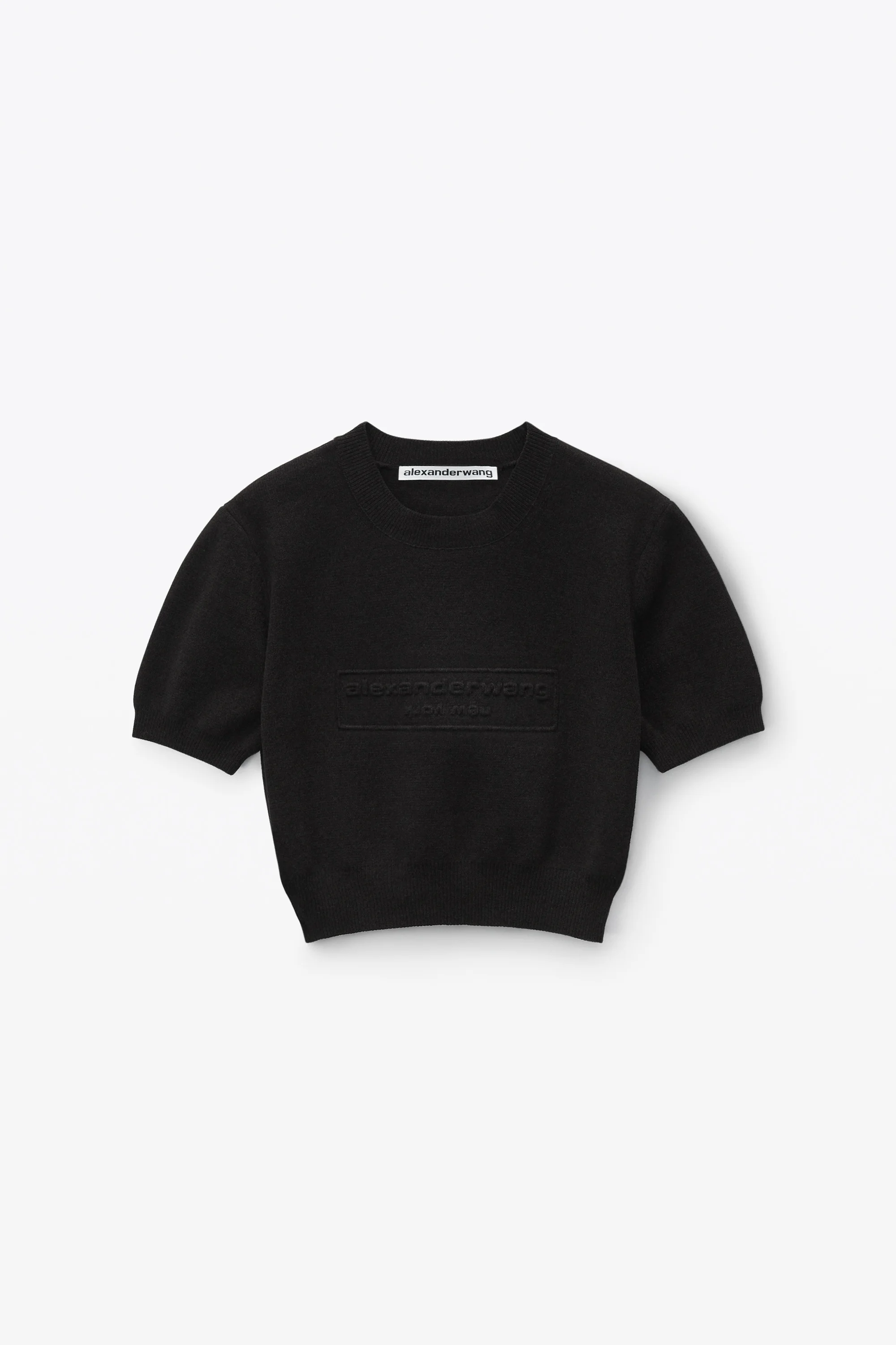 cropped short sleeve pullover with embossed "alexander wang new york" logo at front in black ribbed chenille - relaxed fit - hem hits at waist - classic sweater rib trims - composition: 89% polyester / 9% polyamide / 2% elastane - made in china - model is 5'10" and wears a size s - 1KC3231037001