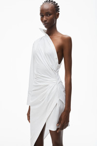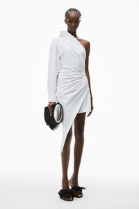 this white long-sleeve dress, characterized by an asymmetric neckline and angled hem, reflects this collection's sense of keen-edged femininity. the button placket with mother-of-pearl buttons enhances the modern tailoring details of this ruched midi silhouette. - asymmetric neckline - long sleeves - concealed zip closure - body composition: 96% cotton, 4% elastane - mother of pearl buttons - made in china - model is 5'11" and wears a size 2 - 1wc4246704100 composition Body/Exterieur: 96%COTTON/4%ELASTANE
