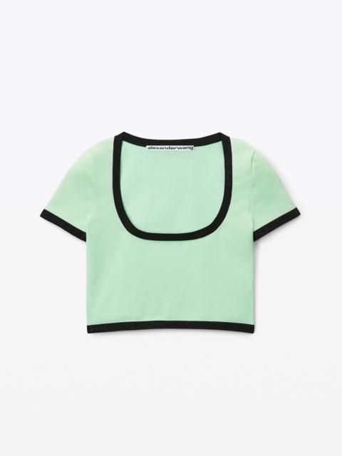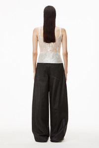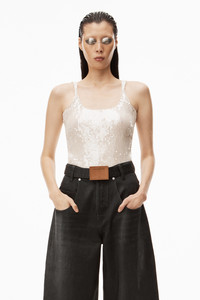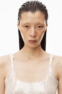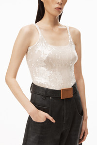 scoopneck tank top with allover engineered sequin embroidery in snow white sheer ribbed nylon - bodycon fit - hem hits at hip - composition: 100% polyester - made in china - model is 5'10" and wears a size s - 1KC2231055110 composition 100%POLYESTER