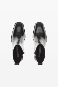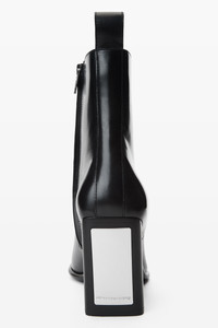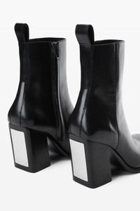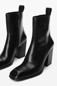 this black semi-shiny calf leather throttle ankle boot features a sculpted heel showcasing a logo plate. it sits on a 95mm heel, cushioned by a padded footbed. - square toe - zip closure - upper: cow leather - lining: calf leather - outsole: cow leather - heel height: 95mm / 3.7in - made in china - 30424b036001 composition UPPER: 100%COW LEATHER LINING: 100%CALF LEATHER OUTSOLE: 100%COW LEATHER