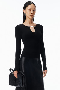 Fitted short-sleeve pullover in matte rayon jersey. Designed with a clean split V-neckline and polished metal logo plate at center chest. - Black - short sleeves - bodycon silhouette - body composition: 75% viscose/23% polyamide/2% elastane - trim: 75% viscose/23% polyamide/2% elastane - Made in Vietnam - Model is 5'11" and Wears a Size S - 1KC1261095001 composition Body: 75%VISCOSE/23%POLYAMIDE/2%ELASTANE Trim: 75%VISCOSE/23%POLYAMIDE/2%ELASTANE