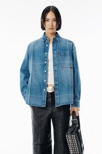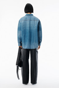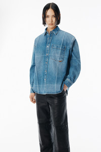 Button-down shirt in vintage marbled blue indigo denim, finished with hand-sanded foldlines reinforced from the inside for a crisp, pressed look. Designed with a straight oversized fit, dropped shoulders, and denim shank placket, it’s detailed with a patch pocket and tan logo flag at the hem. - denim shank button placket - dropped shoulders - patch pocket with tan logo flag - straight oversized silhouette - body composition: 100% cotton - model is 5'11" and wears a size S - made in China - 4DC4252847400C composition Body: 100%COTTON