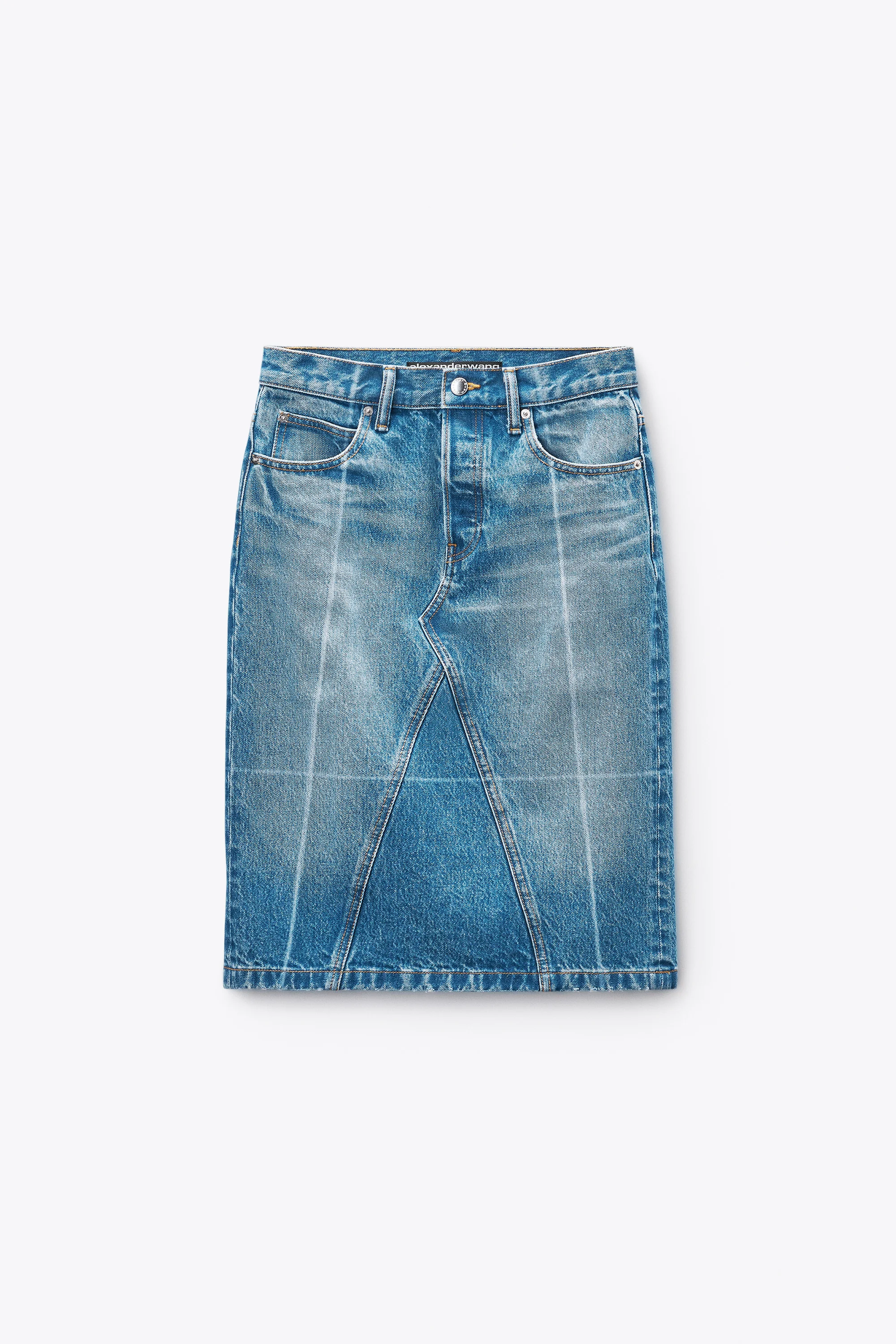 Straight skirt in vintage marbled blue deep indigo denim, detailed with hand-sanded foldlines reinforced by interior fusible to create crisp, pressed vertical creases. Designed with a mid-rise waist and a length that falls just below the knee. Finished with classic five-pocket construction and a tan logo patch at the back. - belt loops - button fly closure - five-pocket style - body composition: 100% cotton - model is 5'11" and wears a size 27 - made in China - 4DC4255849400C composition Body: 100%COTTON