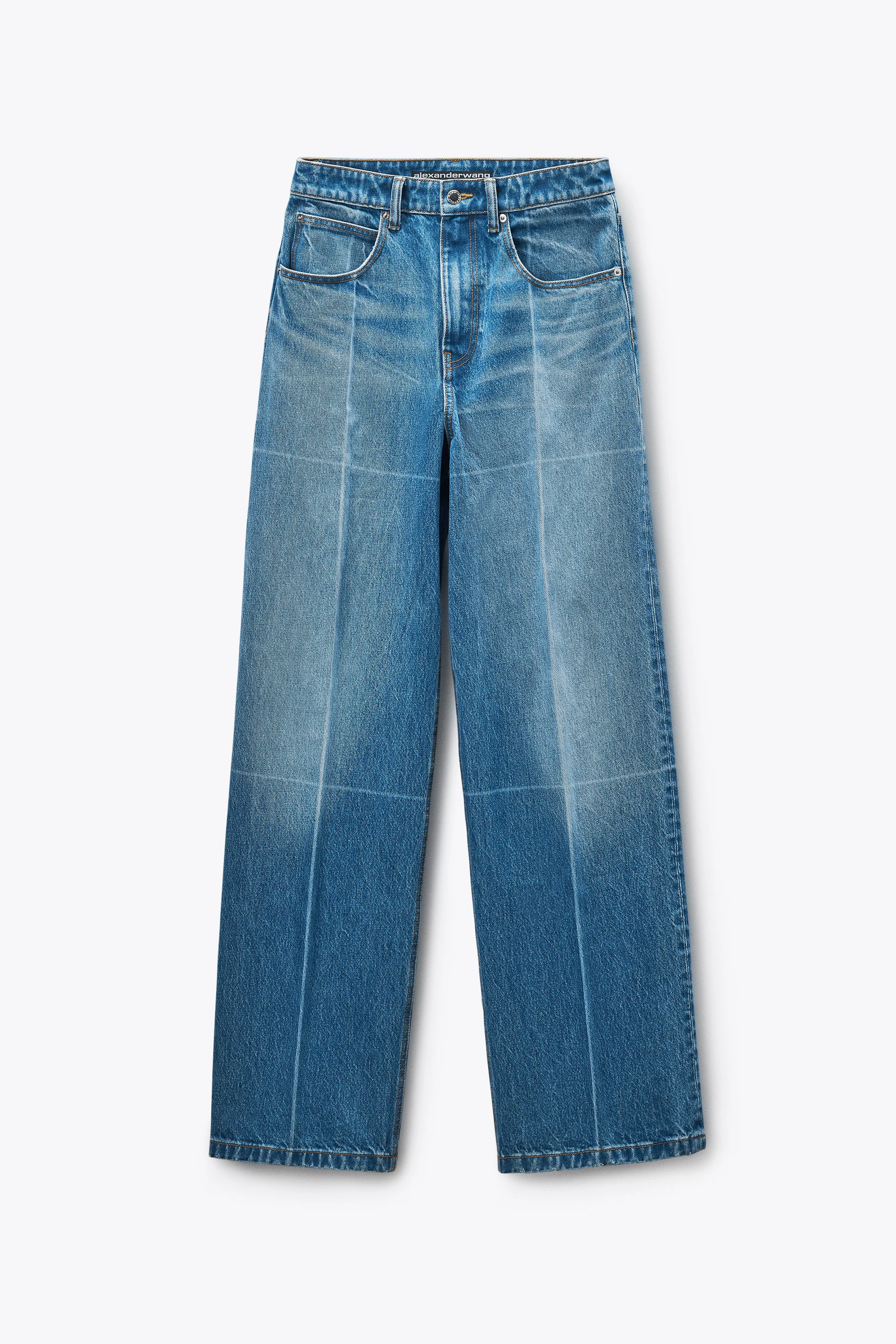 Straight-leg jean in vintage marbled blue deep indigo denim with wide, oversized proportions. Hand-sanded foldlines are reinforced with interior fusible to create crisp, pressed creases. Sits low on the waist and finished with classic five-pocket construction and a tan logo patch at the back pocket. - belt loops - zip fly - five-pocket style - wide, oversized straight-leg fit - model is 5'11" and wears a size 27 - made in China - body composition: 100% cotton - 4DC4254848400C composition Body: 100%COTTON