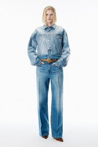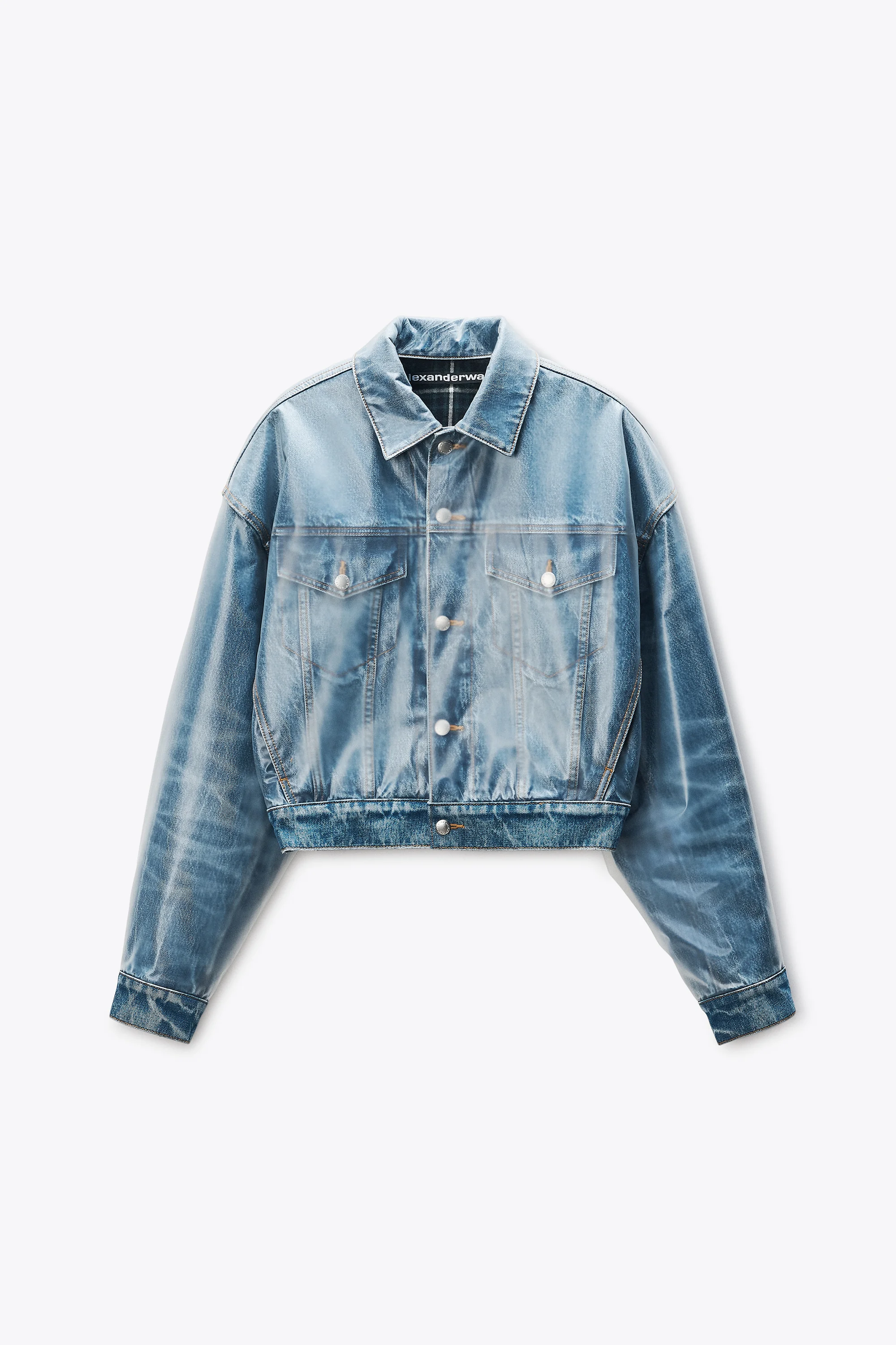 Trucker jacket crafted in vintage marbled blue deep indigo cotton denim, wrapped in a sheer polyurethane film. Designed with wide dropped shoulders and rounded volume, it features denim shank hardware, welt pockets, and a tan logo patch at the center back waistband. The outer film layer serves as a protective shell over the base denim structure. - classic collar - long sleeves - denim shank fastening - pocket flaps - welt pockets and back tabs - rounded cut - body composition: 100% polyurethane - model is 5'11" and wears a size xs/s - made in China - 4DC4252846400C composition OUTER LAYER 100.0%: 100%POLYURETHANE Body: 100%COTTON Lining: 100%COTTON