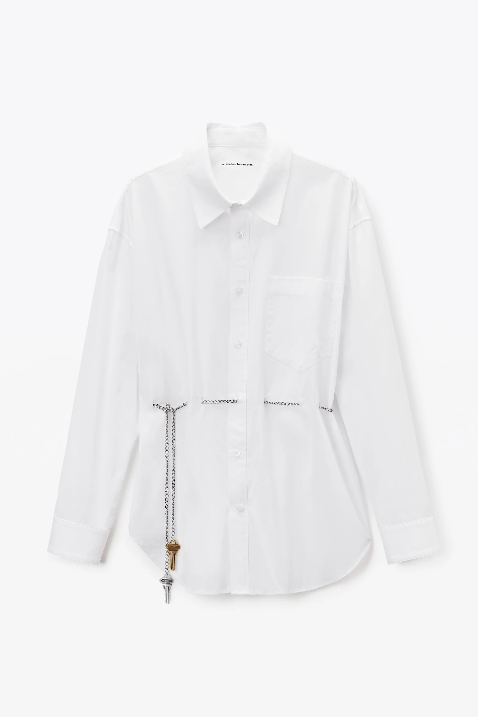 This organic cotton white shirt features a twisted design with a stylized knot at the side and cold-shoulder detail. It has a chest pocket with an embroidered logo, pre-styled cuffs, and fastens with a button placket. - point collar - long sleeves, pre-styled cuffs - button placket - body composition: 100% cotton - made in china - model is 5'11" and wears a size s - 1WC3251101100 composition Body: 100%COTTON