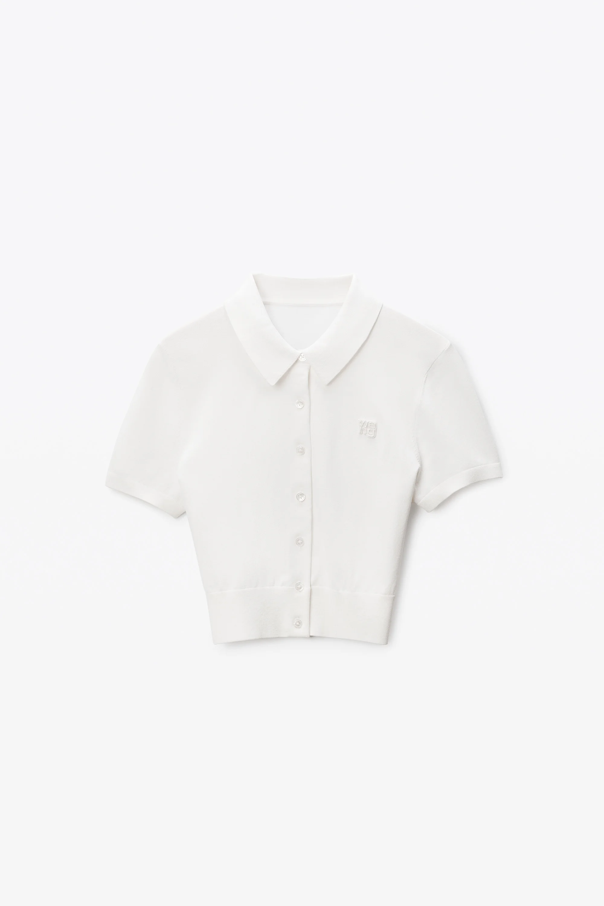 Logo embroidery at the chest elevates this short-sleeve polo cardigan in soft white. It fastens with shell buttons and is detailed with rib trims at the cuffs and hem. - cowlneck - short sleeves - button placket - body composition: 73% viscose/22% polyamide/5% elastane - trim: 86% viscose/13% polyamide/1% elastane - made in vietnam - model is 5'11" and wears a size s - 4KC3253065104 composition Body: 73%VISCOSE/22%POLYAMIDE/5%ELASTANE Trim: 86%VISCOSE/13%POLYAMIDE/1%ELASTANE