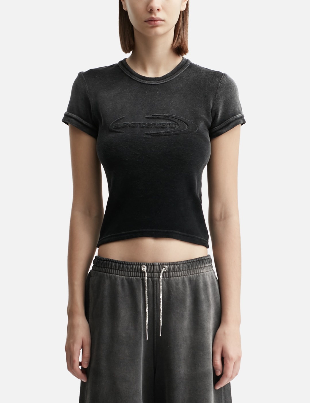 - T By Alexander Wang - Baby T-Shirt - Body-hugging fit - Ribbed crewneck - Short sleeves - Brand logo at front - Color: Washed Nickel - Material: 80% Cotton, 19% Polyester, 1% Elastane - See more T-Shirts and Clothing SIZING - Model wears size S - Model measures: Height 178cm, Chest 30’’/76.2cm, Waist 22.5’’/57.2cm, Hip 34.5’’/87.6cm