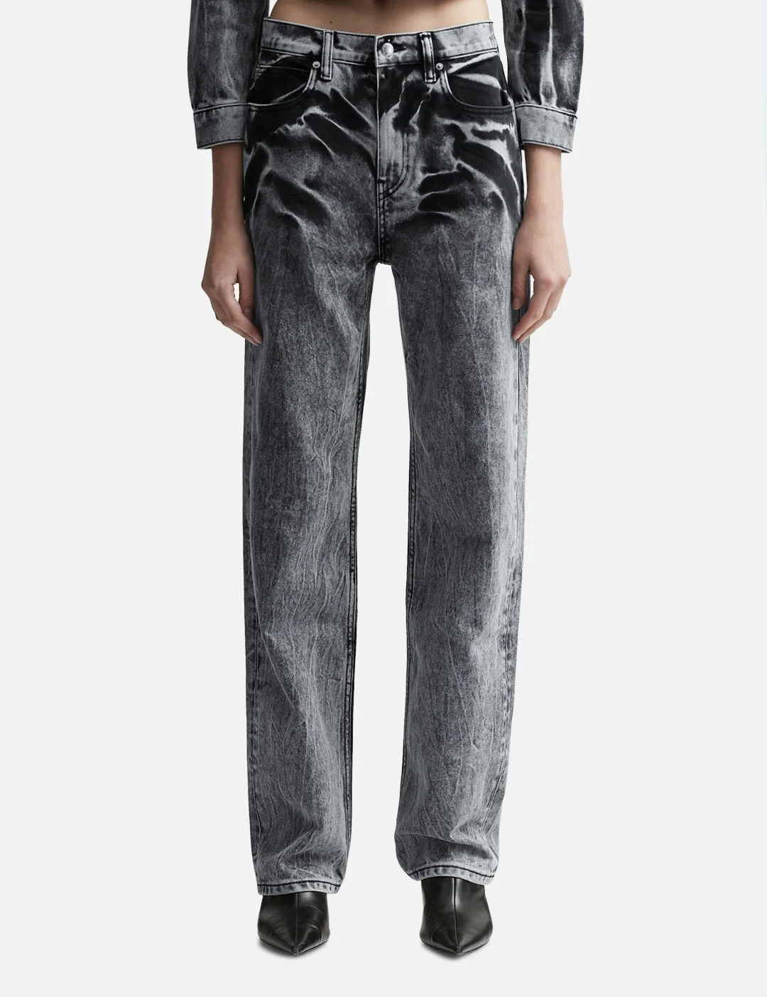 - T By Alexander Wang - Blade Logo-embroidered Ez Mid-rise Wide-leg Jeans - Straight-leg - Crushed black acid wash - Stacked silhouette - Mid-rise - Wide-leg - Belt loops - Flame logo embroidery - Zip fly, button closure - 5-pocket style - Color: Black Acid Crush - Material: 100% Cotton - See more Jeans and Clothing SIZING - Model wears size 26 - Model measures: Height 177cm, Chest 32”/81cm, Waist 23.5”/59.7cm, Hip 33’’/83.8cm