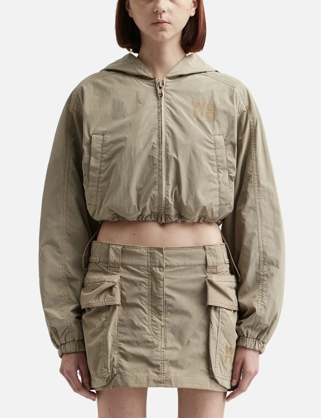 - T By Alexander Wang - Hooded Cropped Zip Jacket - Classic hood - Drop shoulder - Long sleeves - Logo print at the chest - Front zip fastening - Two side welt pockets - Elasticated cuffs and hem - Color: Safari - Material: 100% Cotton - See more Jackets and Clothing SIZING - Model wears size S - Model measures: Height 177cm, Chest 32”/81cm, Waist 23.5”/59.7cm, Hip 33’’/83.8cm